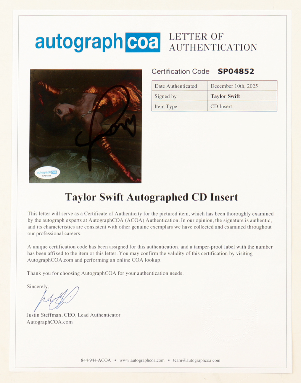 Custom frame measures approximately 8" x 13.5" in size and features a "The Life of a Showgirl" CD insert that has been hand-signed by Taylor Swift. Disc included as shown. Please note, there is some scuffing on the frame.