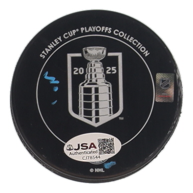 Carolina Panthers 2025 Stanley Cup Champions logo hockey puck has been hand-signed by Jesper Boqvist. Please note, the back of the puck shows stray pen marks.