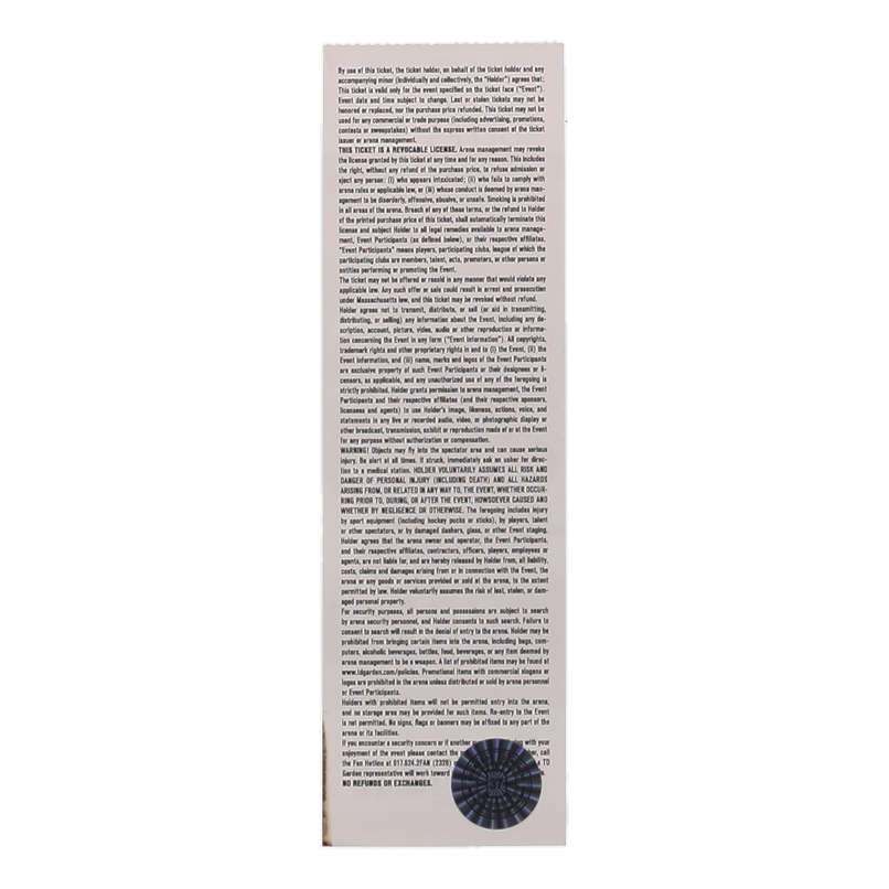 November 19, 2015 ticket has been hand-signed by Patrice Bergeron (Boston Bruins).