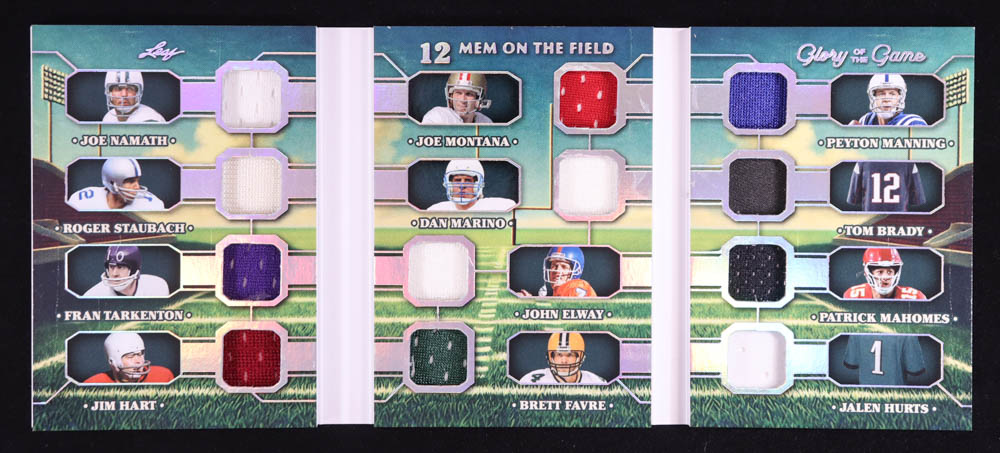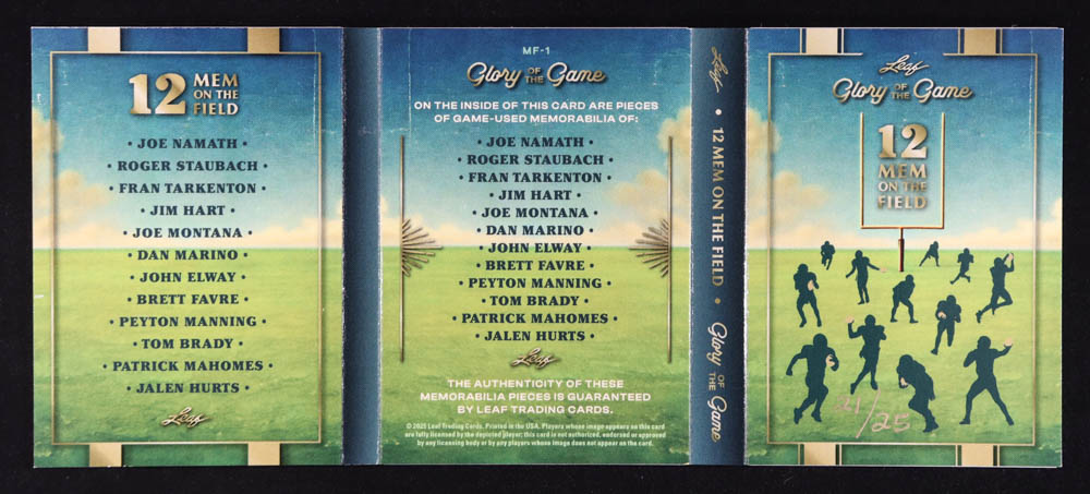 2025 Leaf Glory of the Game 12 Mem on the Field Booklet #MF1 Joe Namath / Roger Staubach / Fran Tarkenton / Jim Hart / Joe Montana / Dan Marino / John Elway / Brett Favre / Peyton Manning / Tom Brady / Patrick Mahomes / Jalen Hurts #21/25