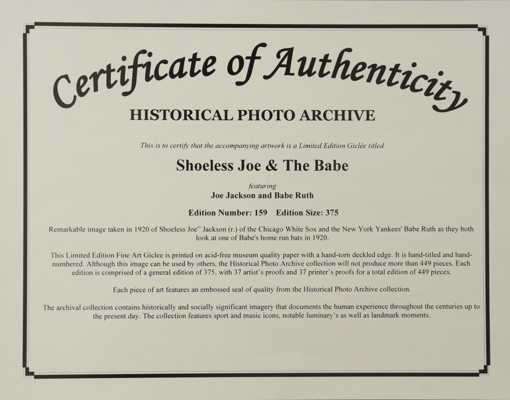 Measures approximately 10.5" x 15" in size. The item is limited edition and you will receive a uniquely numbered of the 375 produced. Despite his ban from Major League Baseball, Jackson had an impressive career batting average of .356, one of the highest in MLB history. His nickname "Shoeless" came from playing in stocking feet during one minor league game due to blisters. He was portrayed as a sympathetic figure, and some still debate whether he was truly guilty.