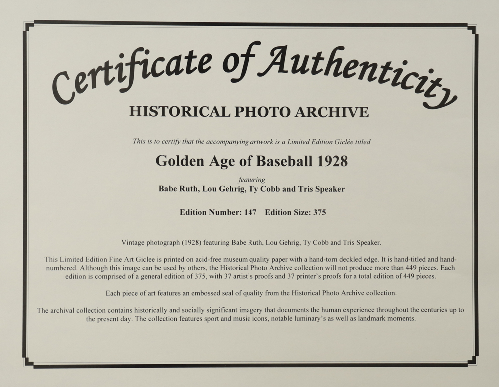 A collectors dream. Giclee photo includes: Babe Ruth, Lou Gehrig, Ty Cobb and Tris Speaker.