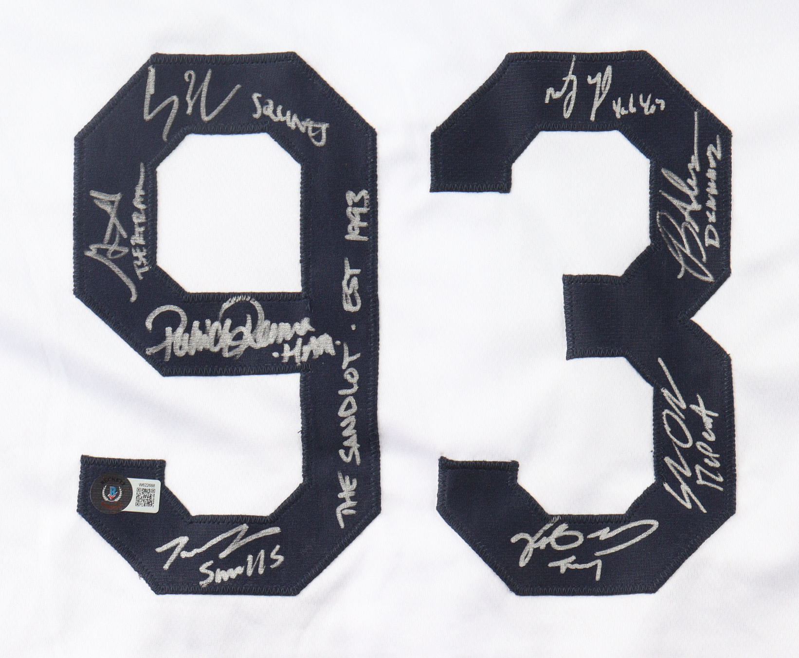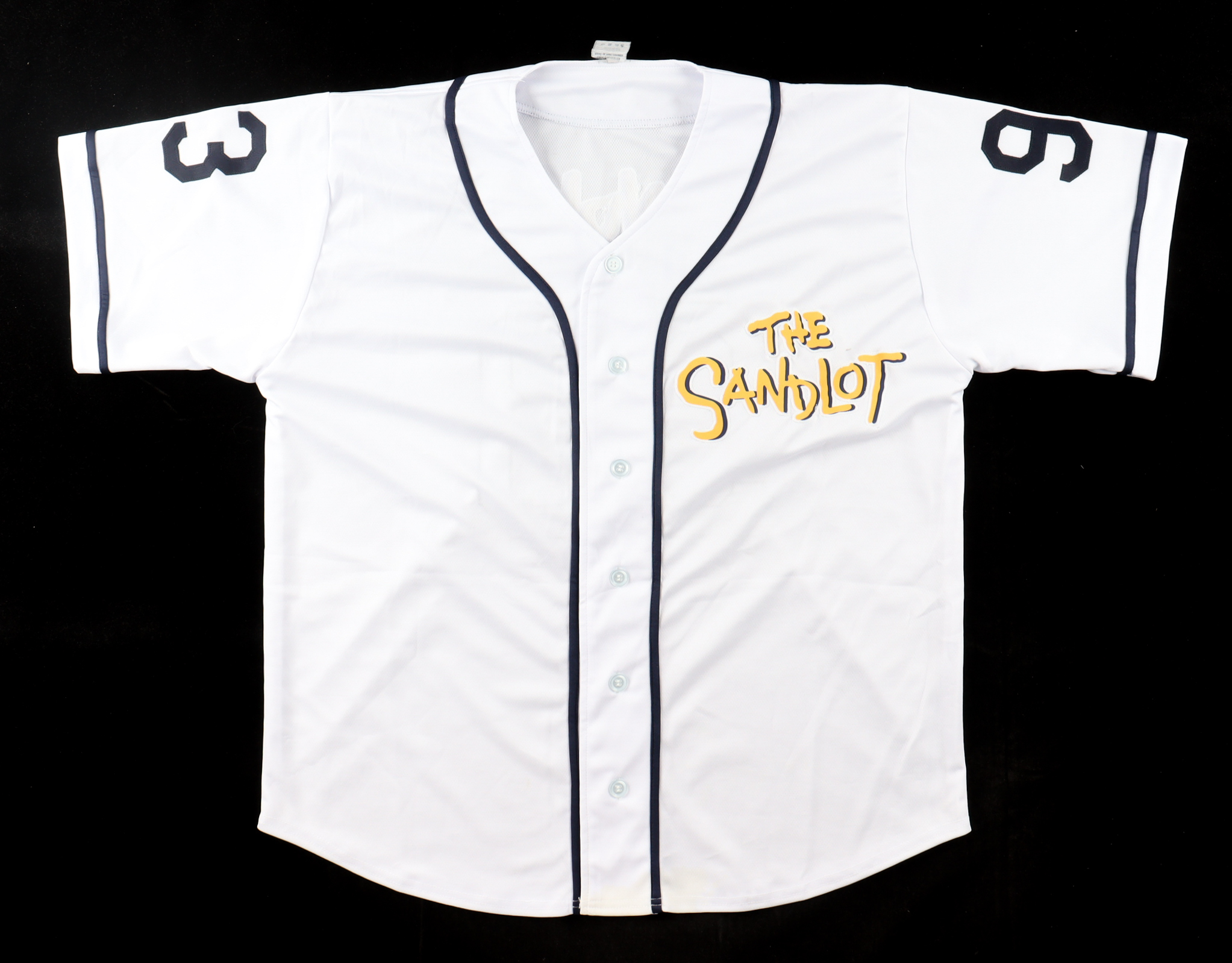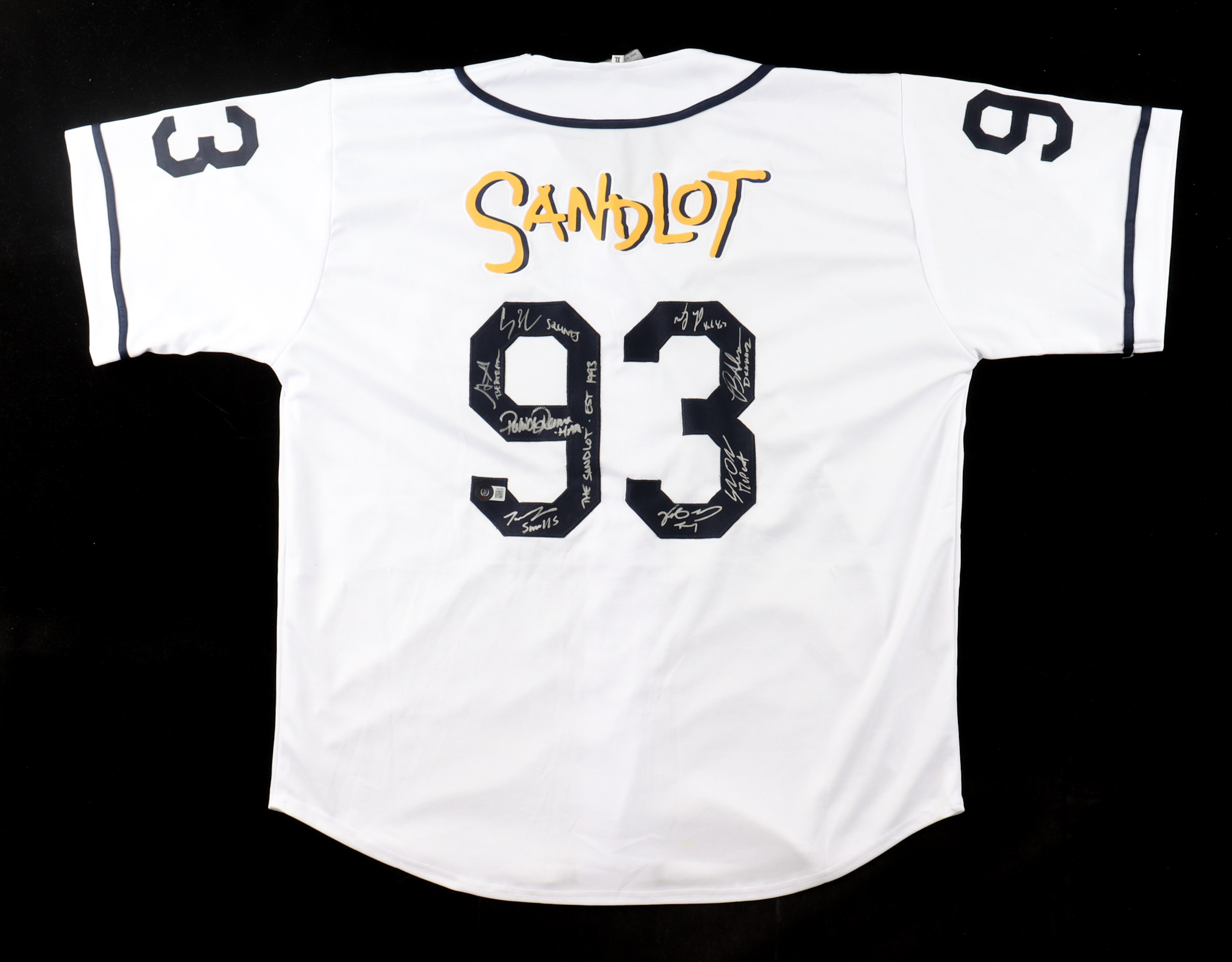 Custom "The Sandlot" jersey with everything sewn on. Hand-signed by Patrick Renna, Tom Guidry, Chauncey Leopardi, Victor DiMattia, Brandon Adams, Shane Obedzinski, Grant Gelt, and Marty York.