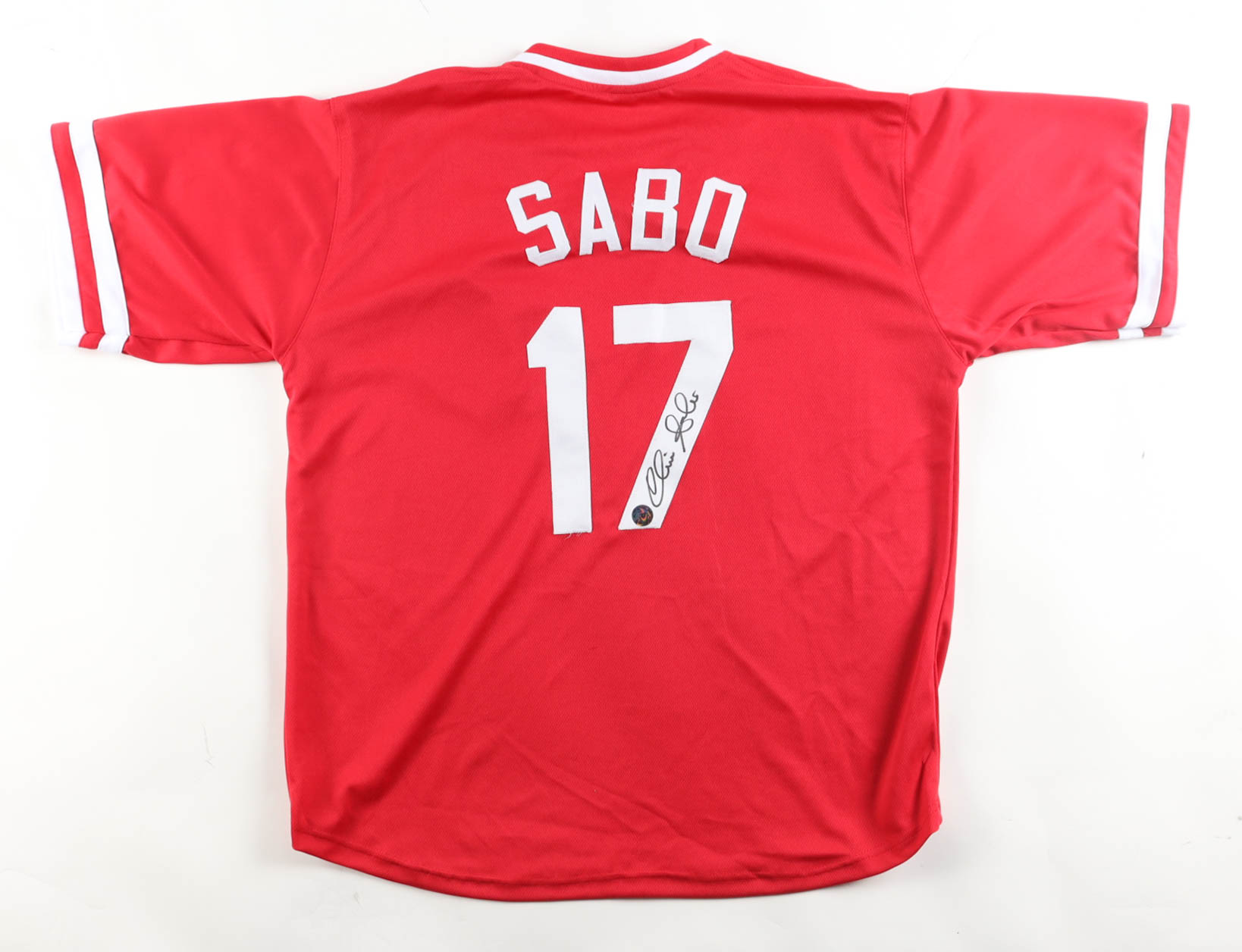 Custom jersey. Everything is sewn on, size XL. Hand signed by Chris Sabo.