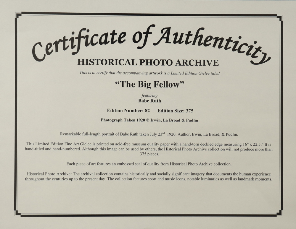 Historical Photo Archive - Babe Ruth "The Big Fellow" Limited Edition 16.5x22 Fine Art Giclee on Paper # 82 /375