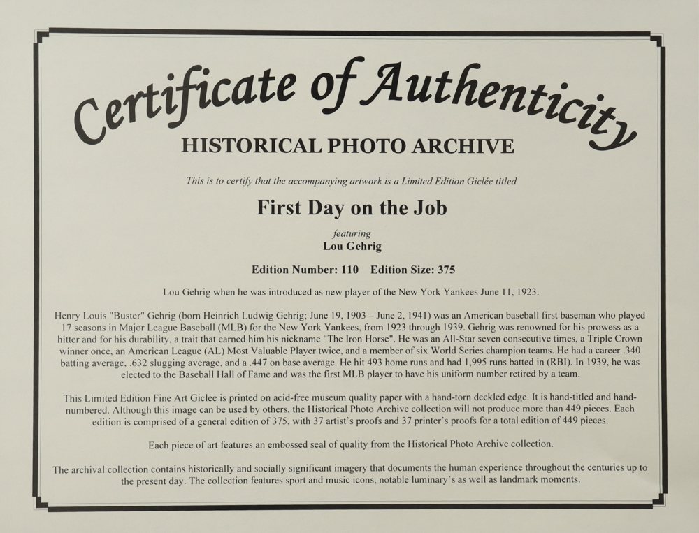 Historical Photo Archive - Lou Gehrig "First Day on the Job" 1923 Limited Edition 16x22.5 Fine Art Giclee on Paper # 110 /375