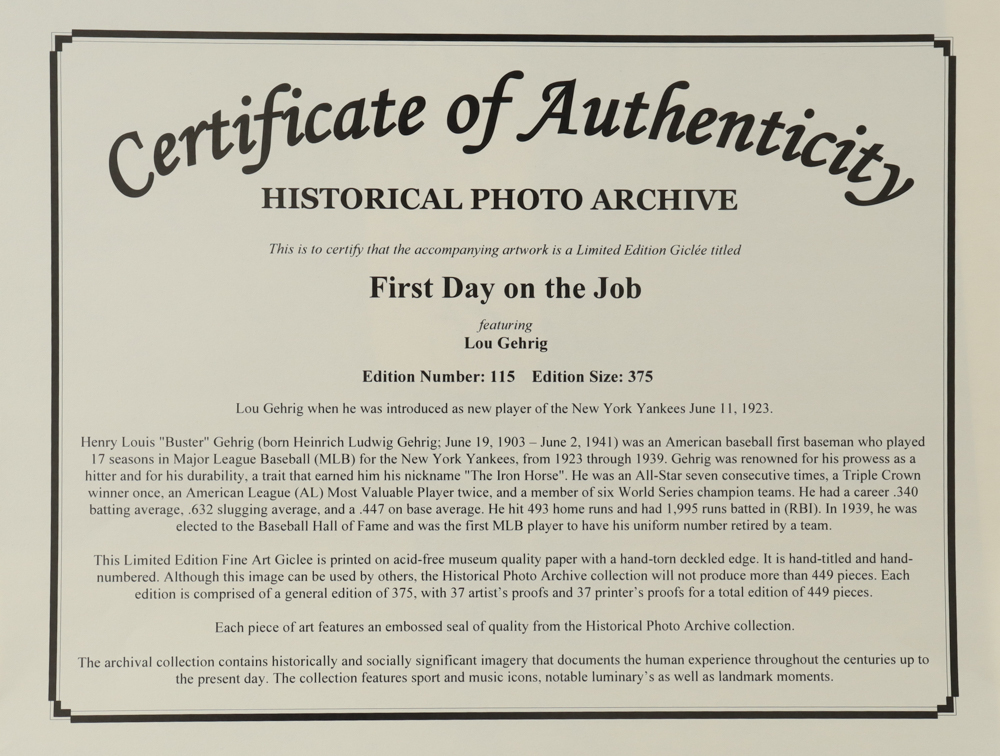 Historical Photo Archive - Lou Gehrig "First Day on the Job" 1923 Limited Edition 16x22.5 Fine Art Giclee on Paper # 115 /375