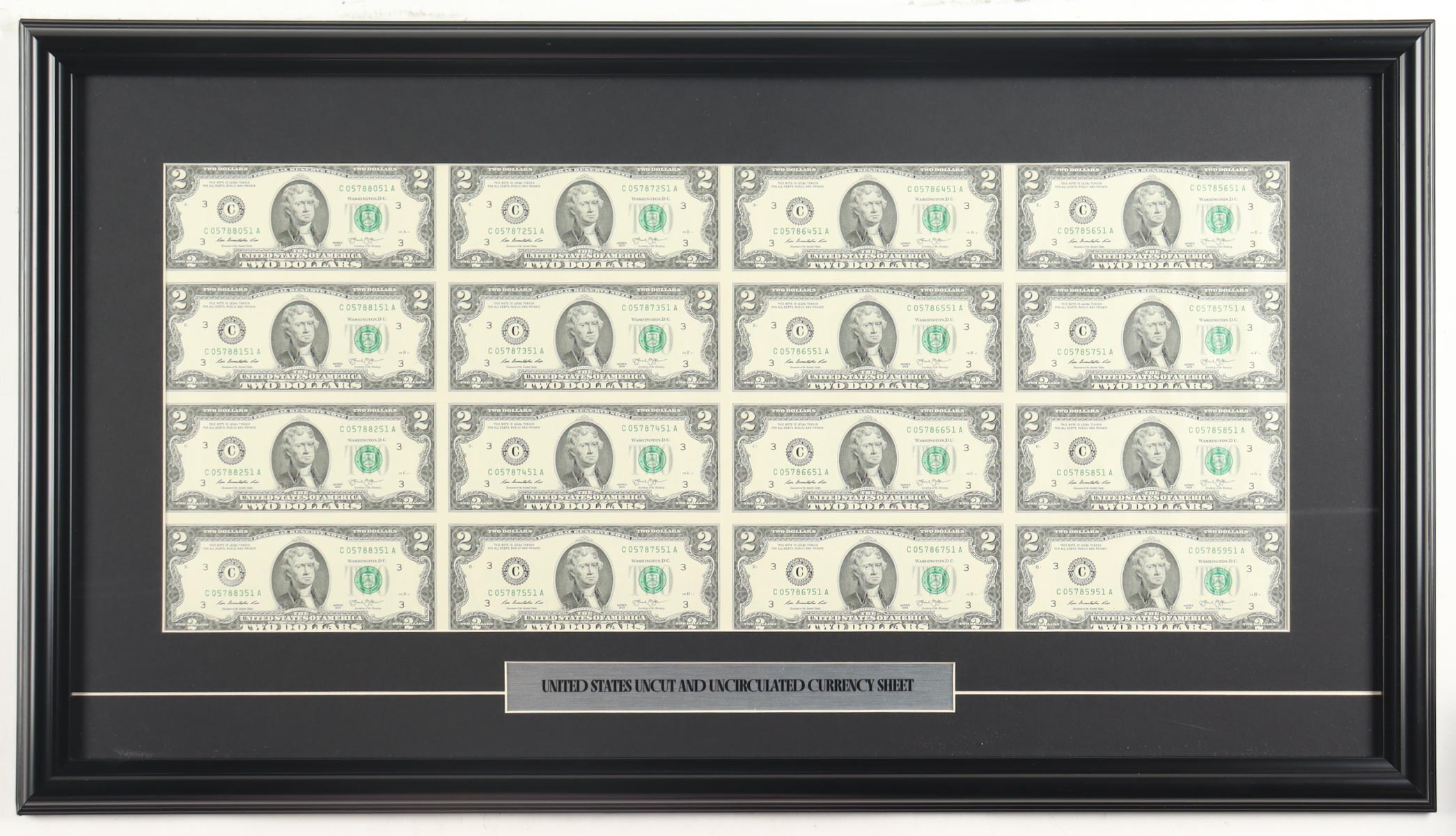 Custom frame measures approximately 17" x 30" in size and features an uncut sheet of (16) 2013 U.S. $2 dollar bills. Please note, the display is unsigned.