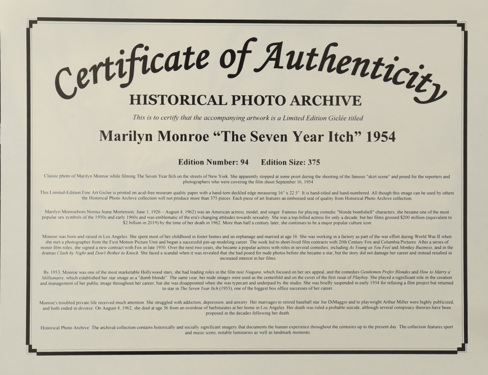 Historical Photo Archive - Marilyn Monroe "The Seven Year Itch" 1954 Limited Edition 16x22.5 Fine Art Giclee on Paper # 94 /375