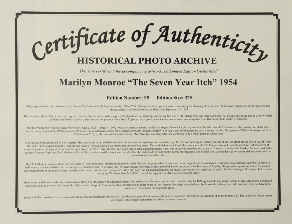 Historical Photo Archive - Marilyn Monroe "The Seven Year Itch" 1954 Limited Edition 16x22.5 Fine Art Giclee on Paper # 95 /375