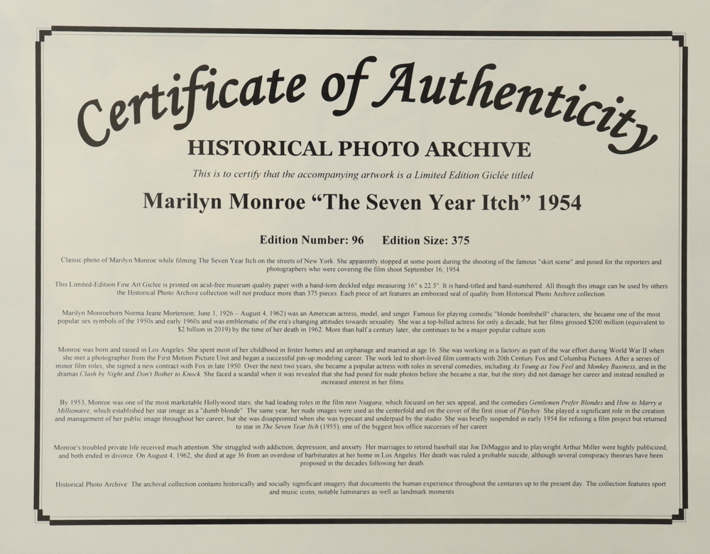 Historical Photo Archive - Marilyn Monroe "The Seven Year Itch" 1954 Limited Edition 16x22.5 Fine Art Giclee on Paper # 96 /375