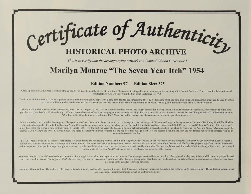 Historical Photo Archive - Marilyn Monroe "The Seven Year Itch" 1954 Limited Edition 16x22.5 Fine Art Giclee on Paper # 97 /375