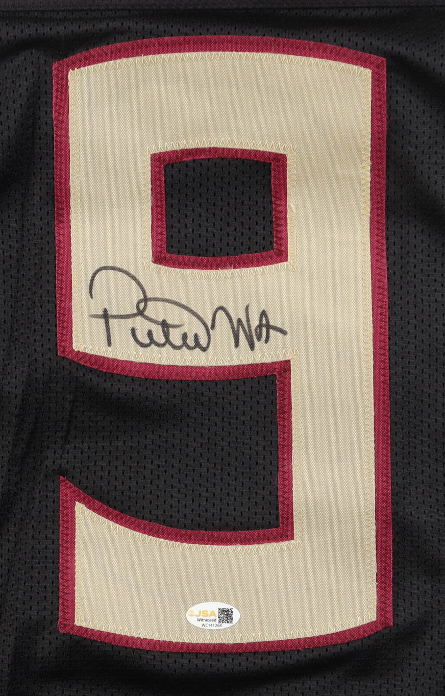 Custom jersey. Everything is sewn on, size XL. Has been hand-signed by Peter Warrick.