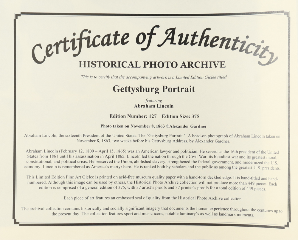 Historical Photo Archive - Abraham Lincoln "Gettysburg Portrait" Limited Edition 16x22.5 Fine Art Giclee on Paper # 127 /375
