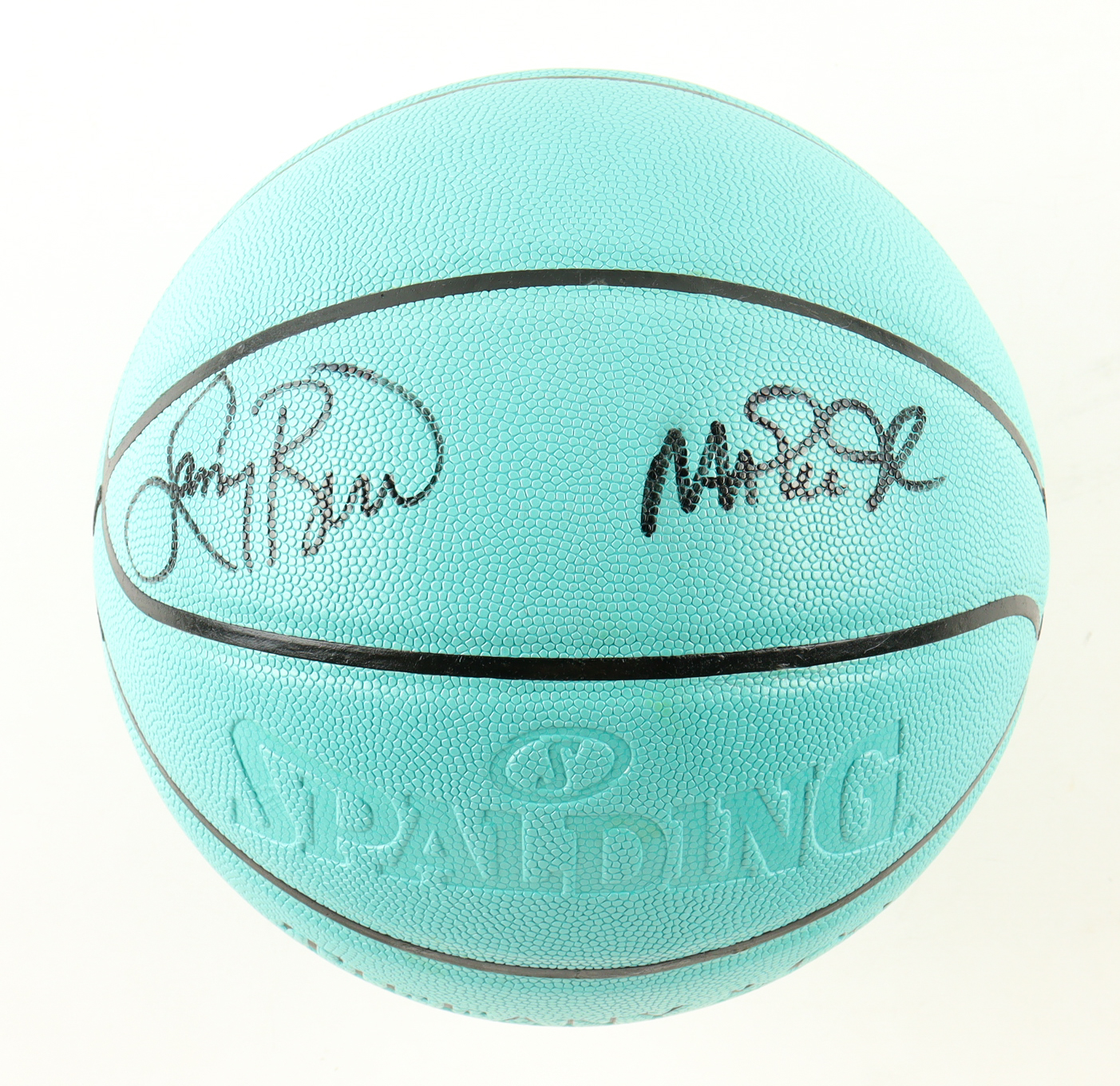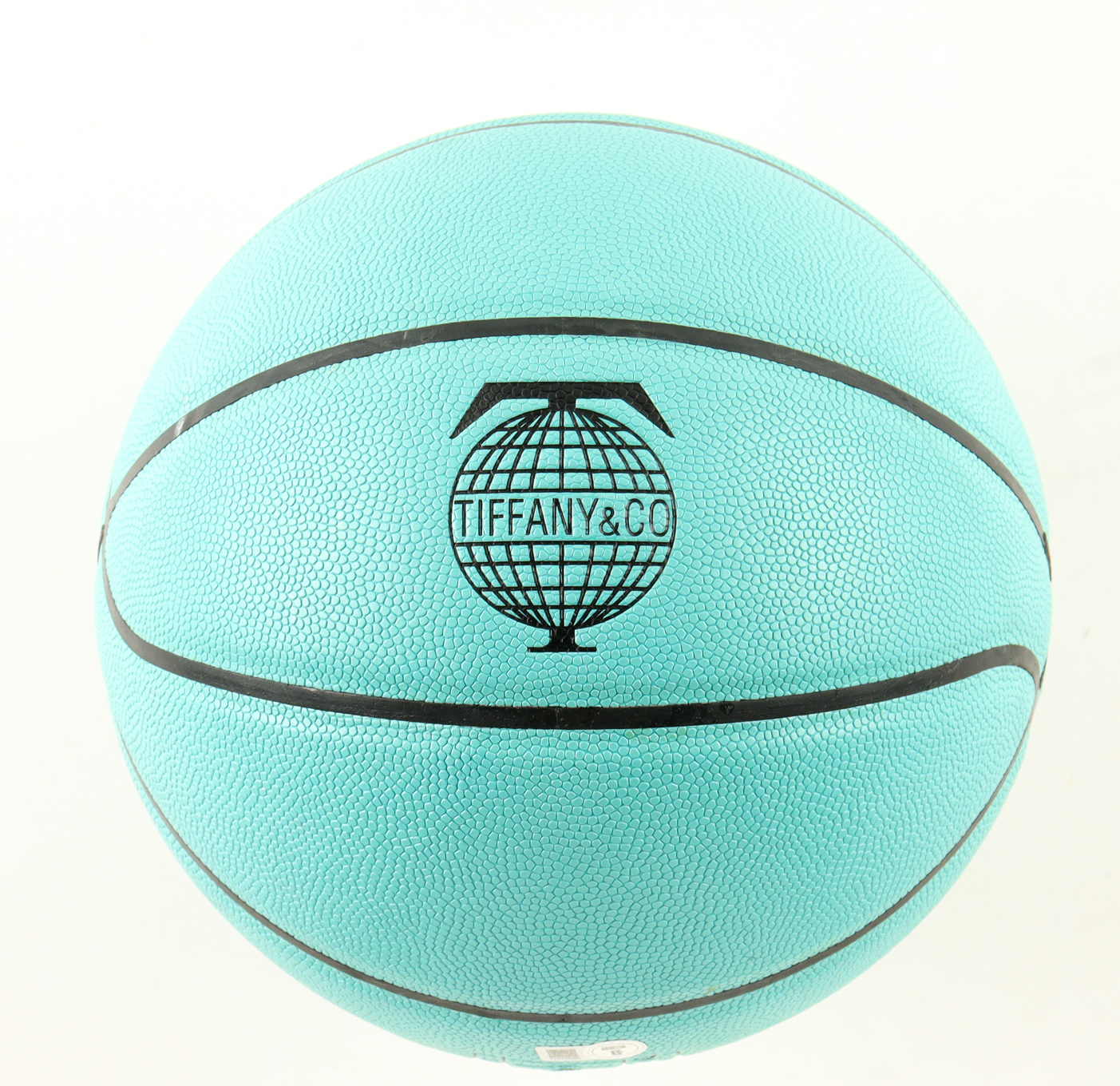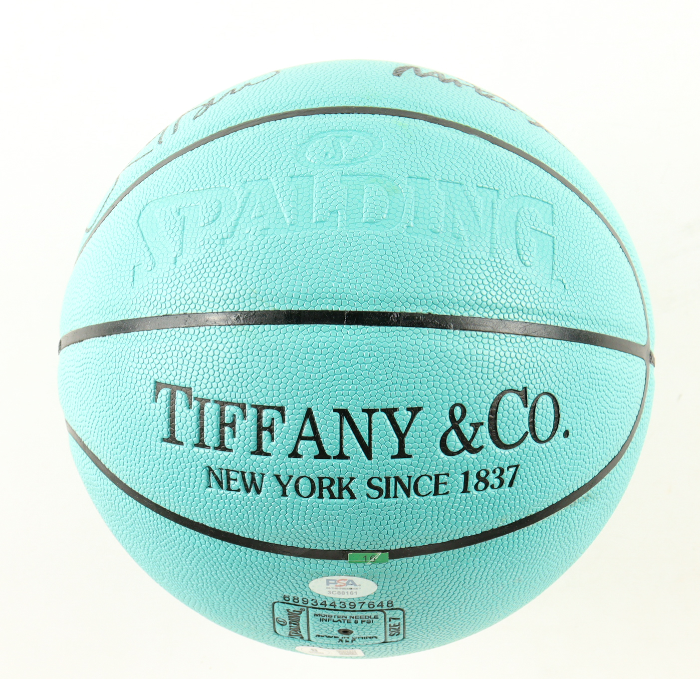 Tiffany & Co. and Spalding collaboration basketball. Hand-signed by Larry Bird (Boston Celtics, HOF) and Magic Johnson (Los Angeles Lakers, HOF). Includes stand as shown.