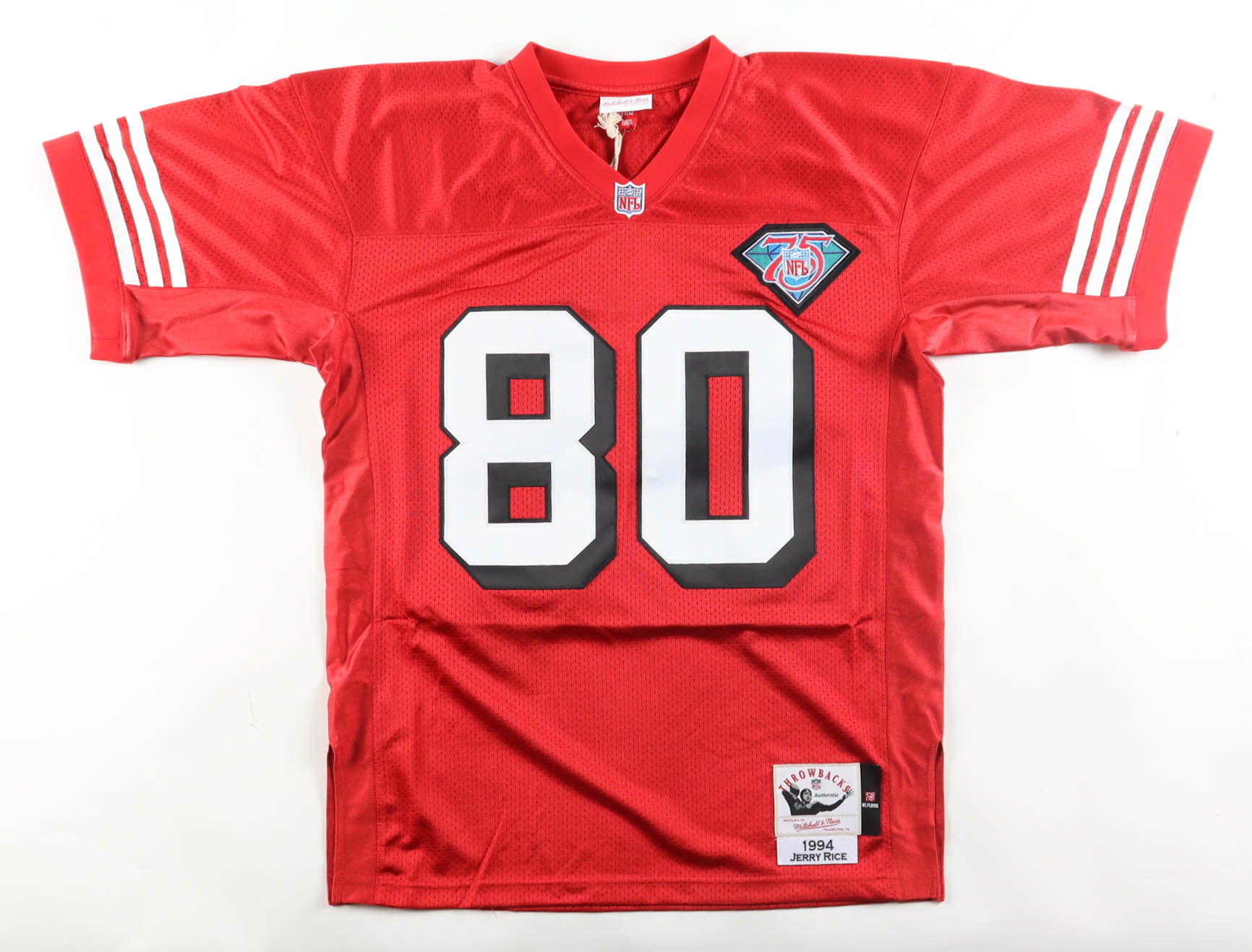 Mitchell & Ness Authentic jersey with everything sewn on, size 44 (L). Hand-signed and inscribed by Jerry Rice (San Francisco 49ers, HOF).