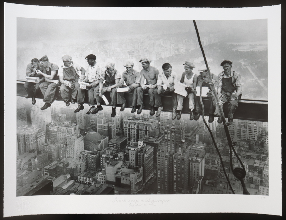 Depicts: Eleven ironworkers casually eating lunch, chatting, and smoking — sitting on a steel beam, 840 feet above the streets of Manhattan with no safety gear.