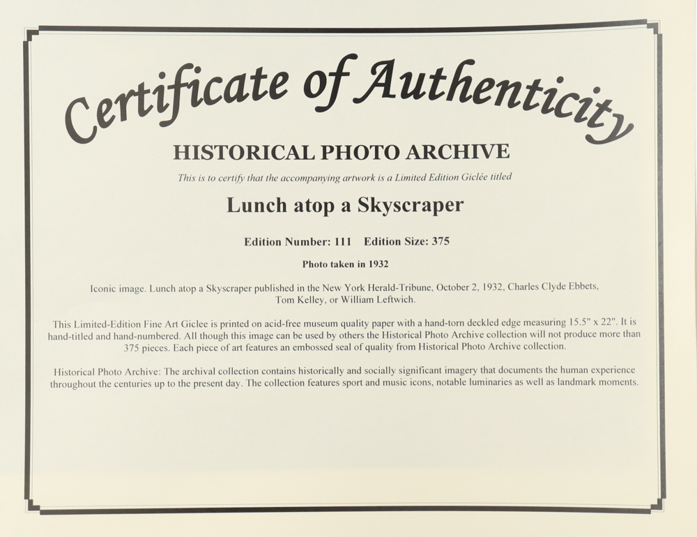 Historical Photo Archive - "Lunch atop a Skyscraper" 1932 Limited Edition 16x22.5 Fine Art Giclee on Paper # 111 /375