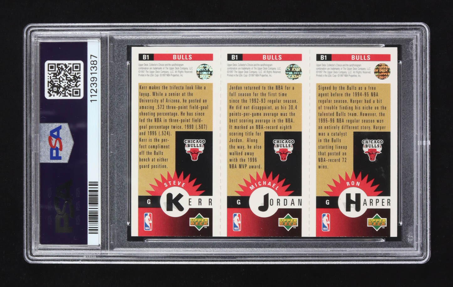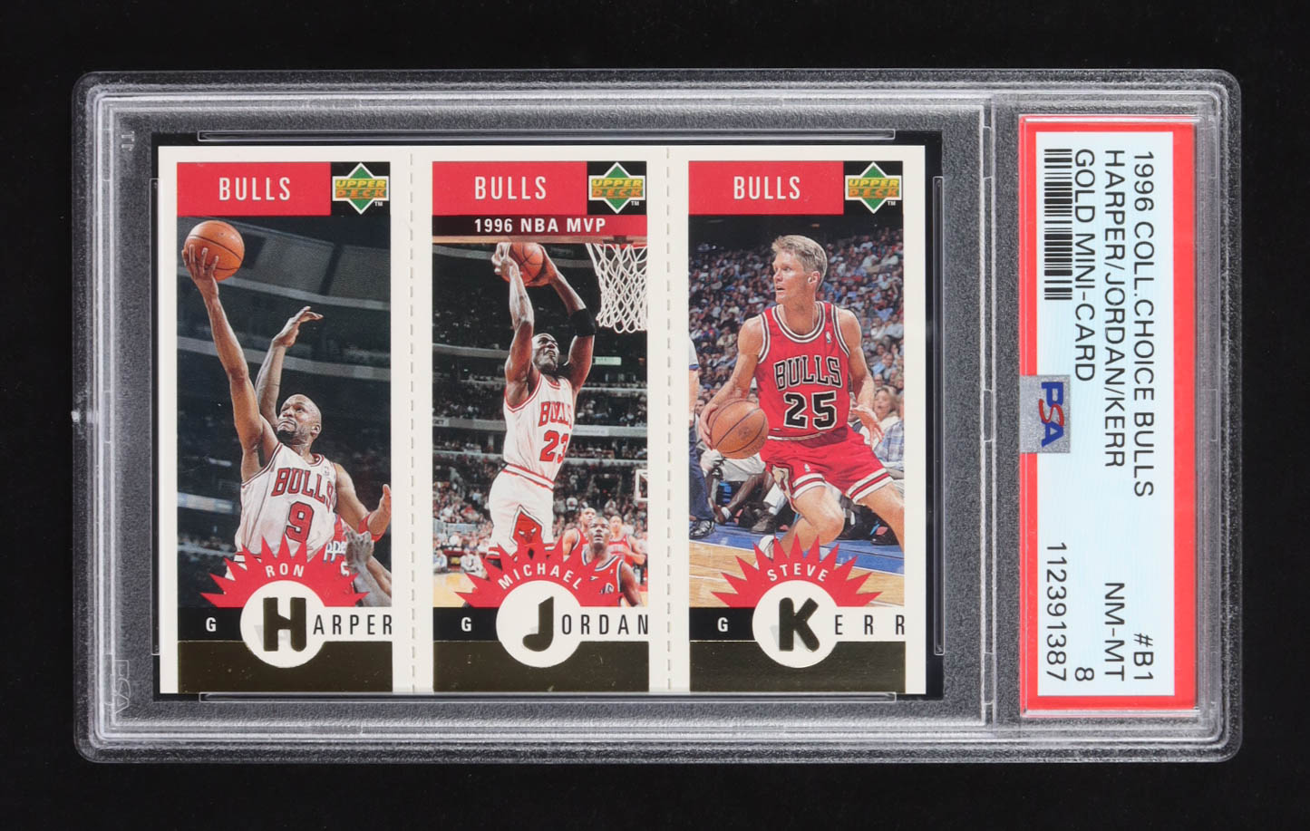 Ron Harper / Michael Jordan / Steve Kerr 1996 Upper Deck Collector's Choice Bulls Gold Mini-Card #B1 (PSA 8)
