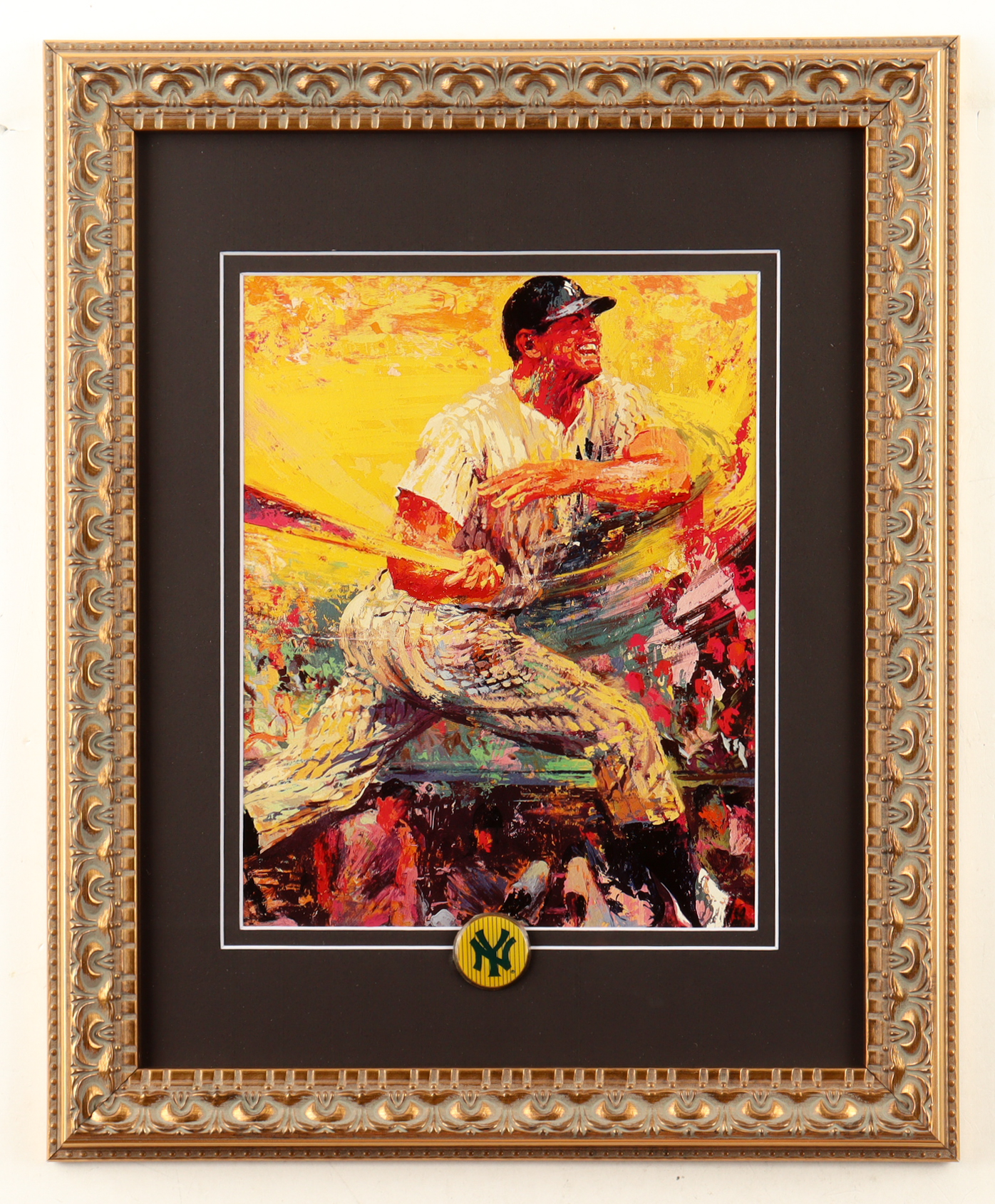 Custom frame measures 13" x 16" in size and features an art print by LeRoy Neiman (D. 2016). Display also includes a vintage New York Yankees logo pin. Please note, item is unsigned. Refer to photos for more details.
