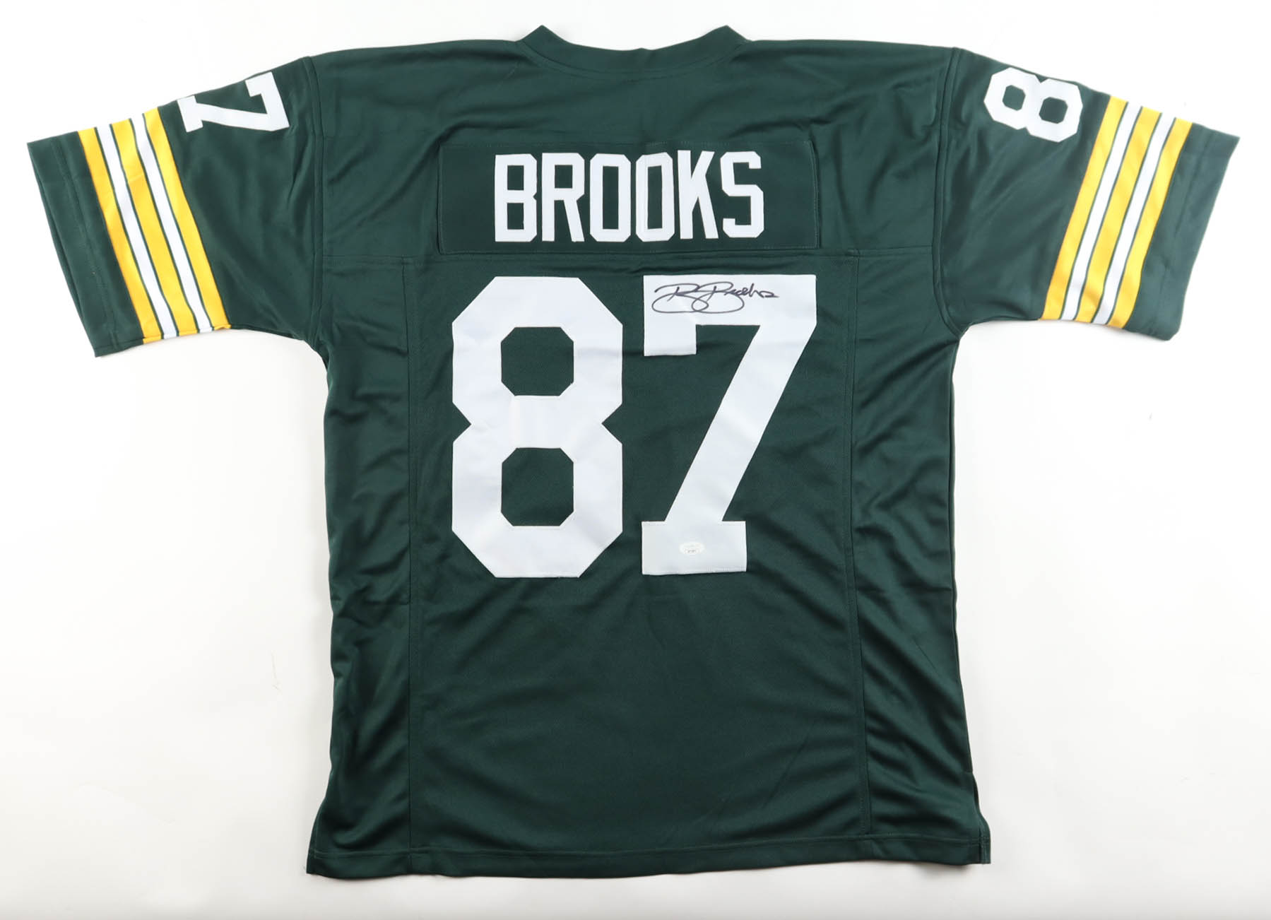 Custom jersey with everything sewn on, size XL. Hand-signed by Robert Brooks.