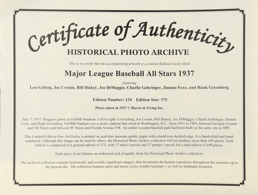 Historical Photo Archive - "Major League Baseball All Stars 1937" with Lou Gehrig, Joe Cronin, Joe DiMaggio, Charlie Gehringer Limited Edition 16x22.5 Fine Art Giclee on Paper # 134 /375