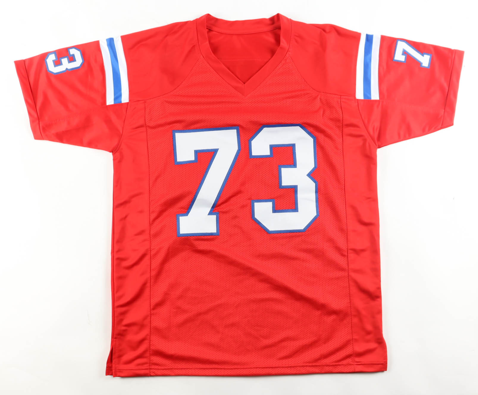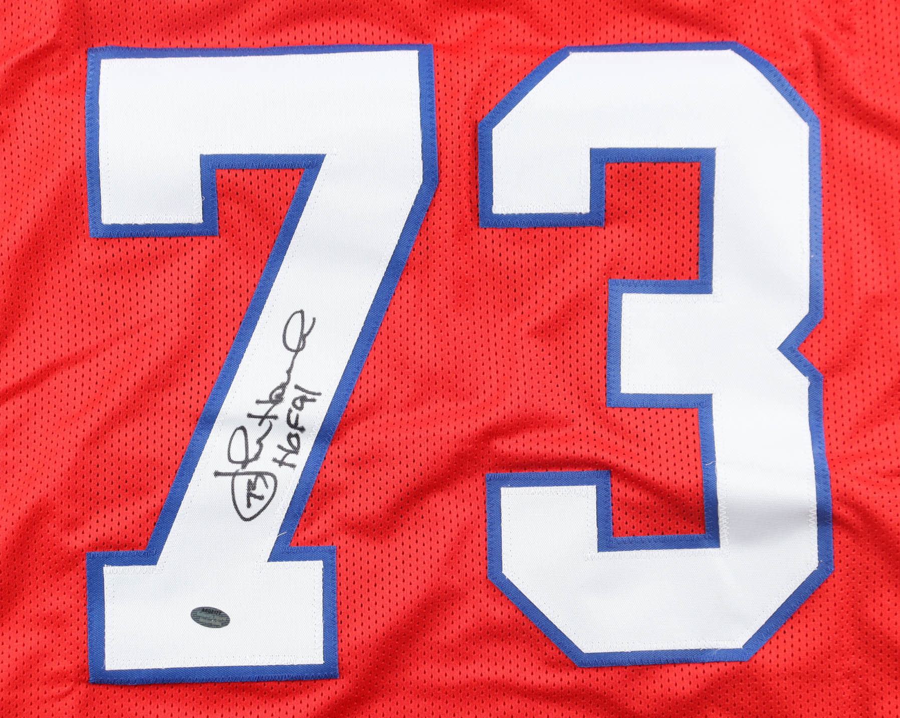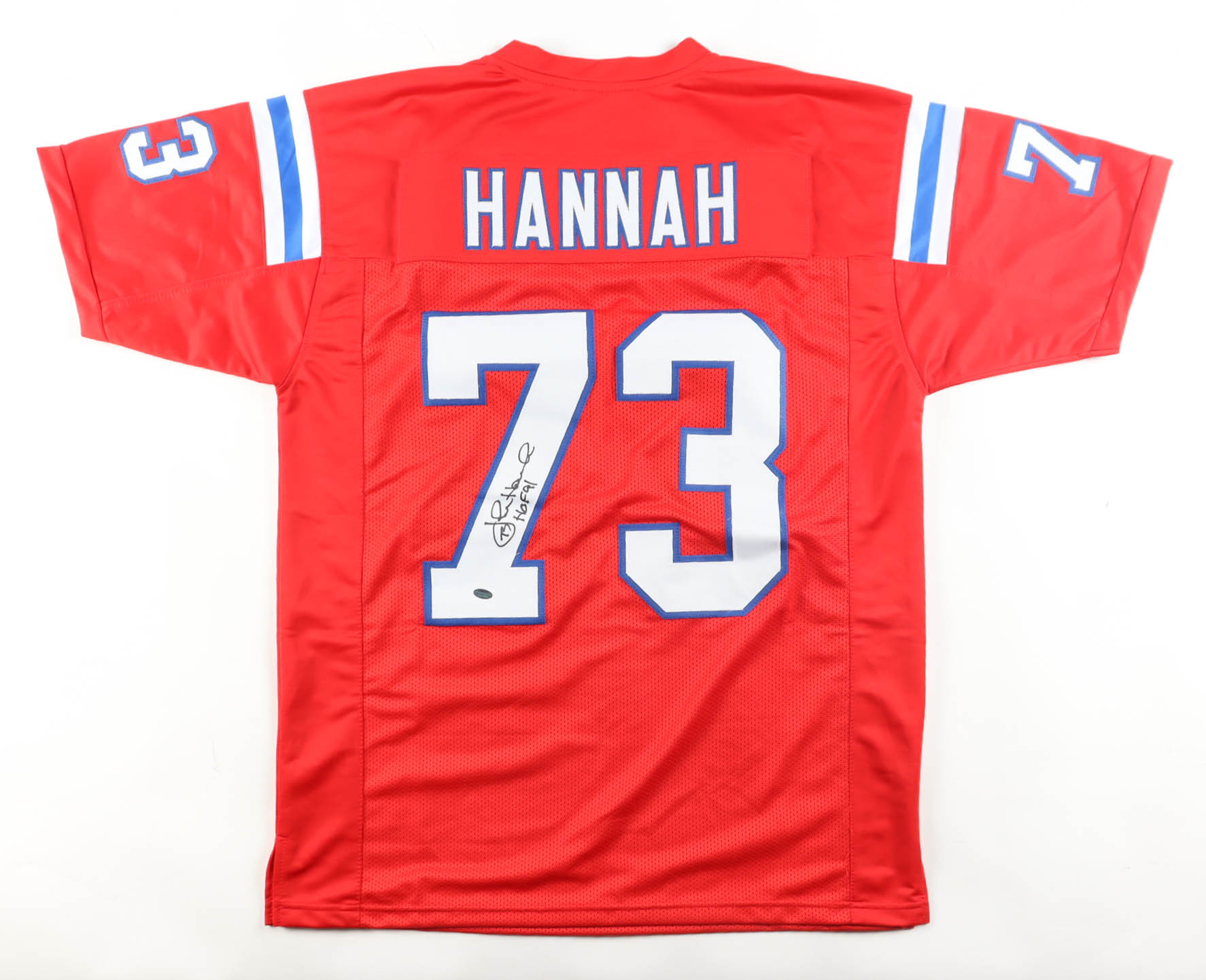 Custom jersey with everything sewn on, size XL. Hand-signed and inscribed by John Hannah (HOF).