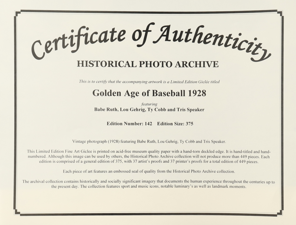 A collectors dream. Giclee photo includes: Babe Ruth, Lou Gehrig, Ty Cobb and Tris Speaker.