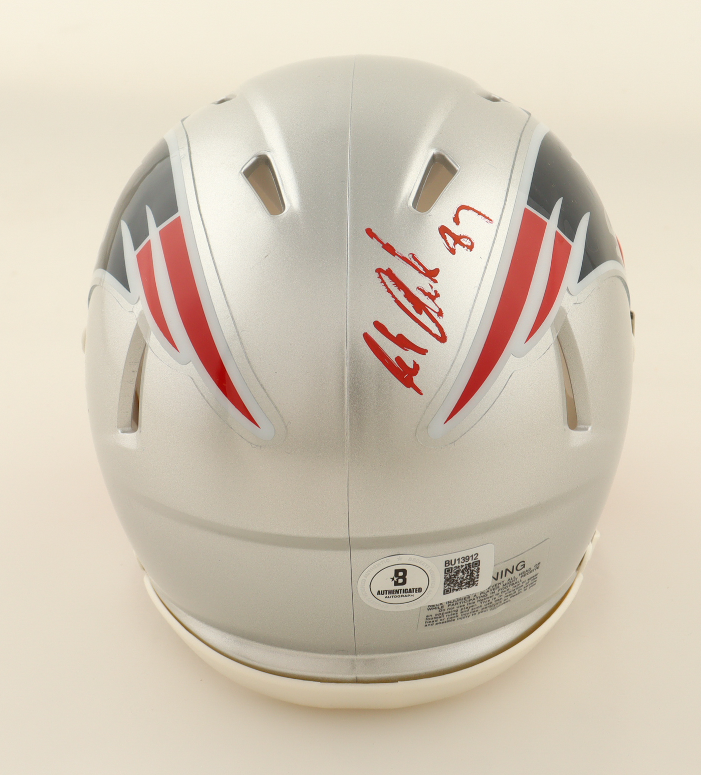 Riddell New England Patriots Speed mini helmet has been hand-signed by Rob Gronkowski.