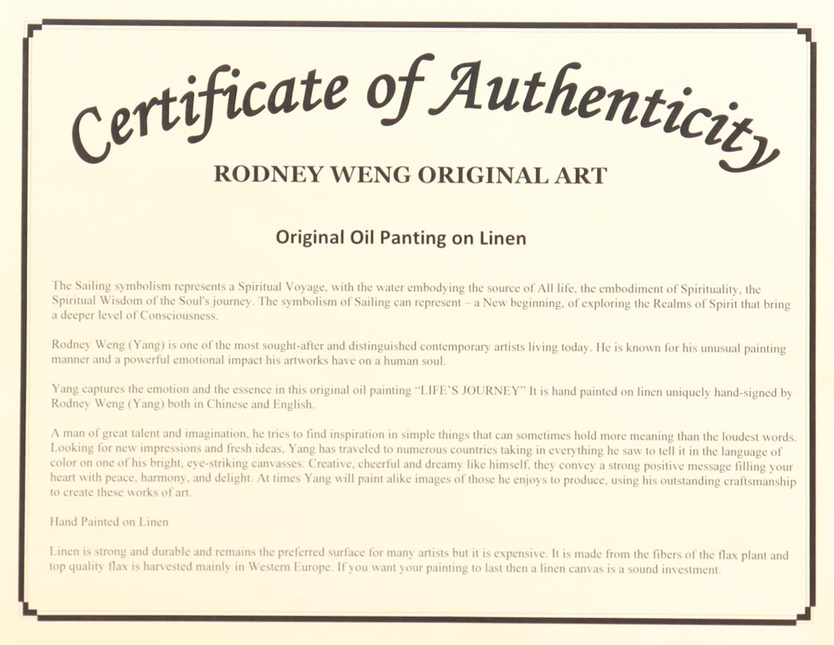 Yang captures the emotion and the essence in this original oil painting “LIFE’S JOURNEY” It is hand painted on linen uniquely hand-signed by Rodney Weng (Yang) both in Chinese and English.