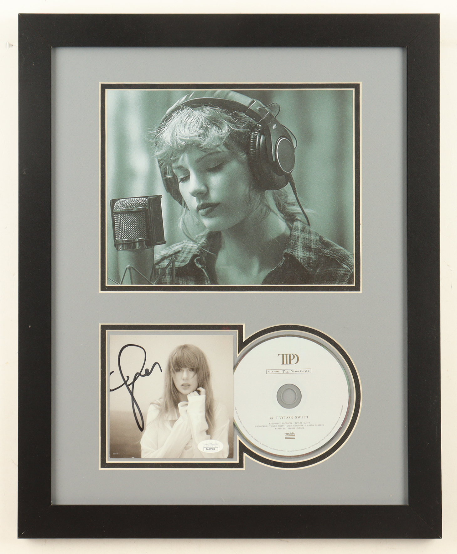 Custom framed insert display measures approximately 16" x 20" in size. Features a CD insert that has been hand-signed by Taylor Swift. Please note, an unsigned CD and photo are also included.