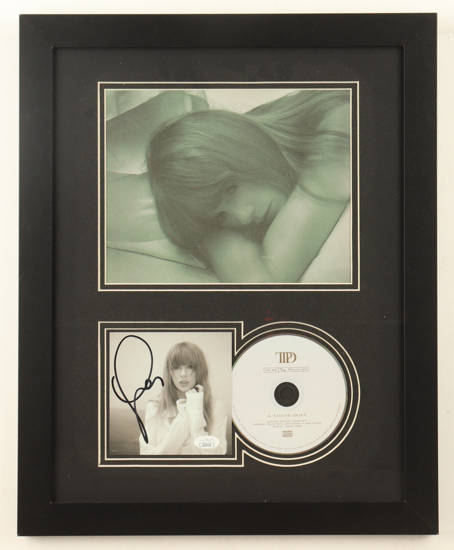 Custom framed insert display measures approximately 16" x 20" in size. Features a CD insert that has been hand-signed by Taylor Swift. Please note, an unsigned CD and photo are also included.