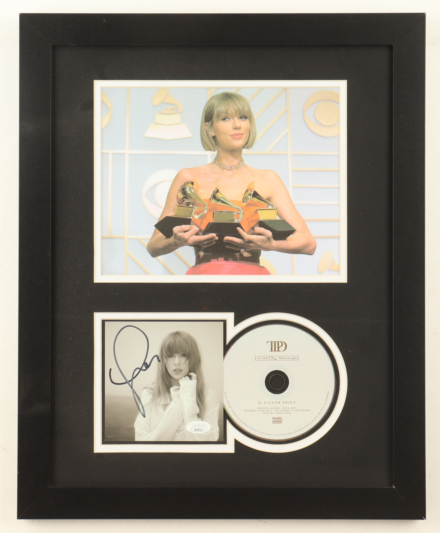Custom framed insert display measures approximately 16" x 20" in size. Features a CD insert that has been hand-signed by Taylor Swift. Please note, an unsigned CD and photo are also included.