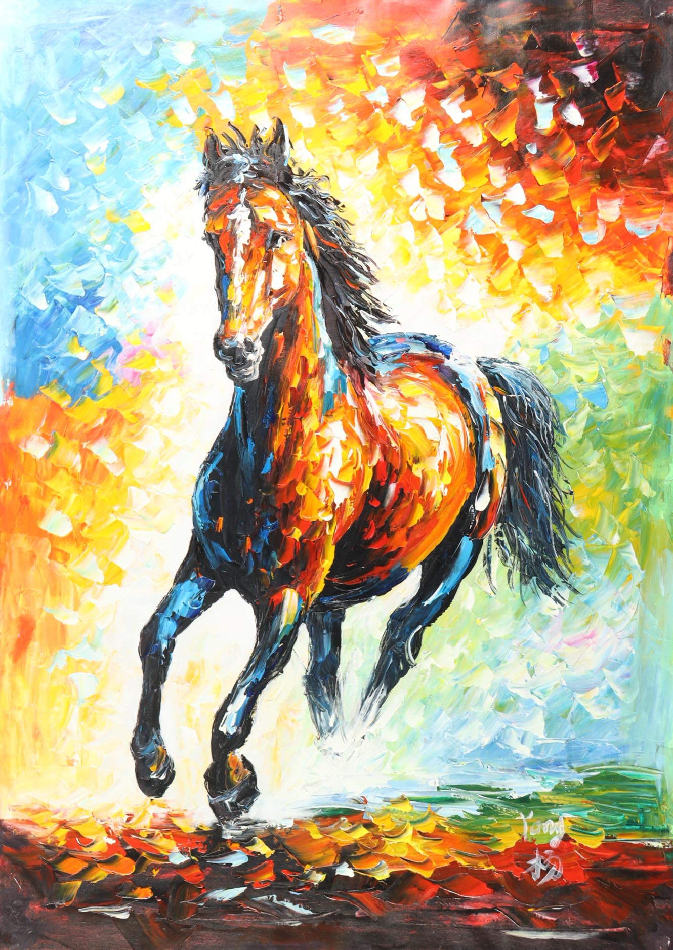 Rodney Weng (Yang) is one of the most sought-after and distinguished contemporary artists living today. He is known for his unusual painting manner and a powerful emotional impact his artworks have on a human soul. Yang captures the emotion and the essence in this original oil painting “PERFECT STRIDE”. It is hand painted on linen uniquely hand-signed by Rodney Weng (Yang) both in Chinese and English.