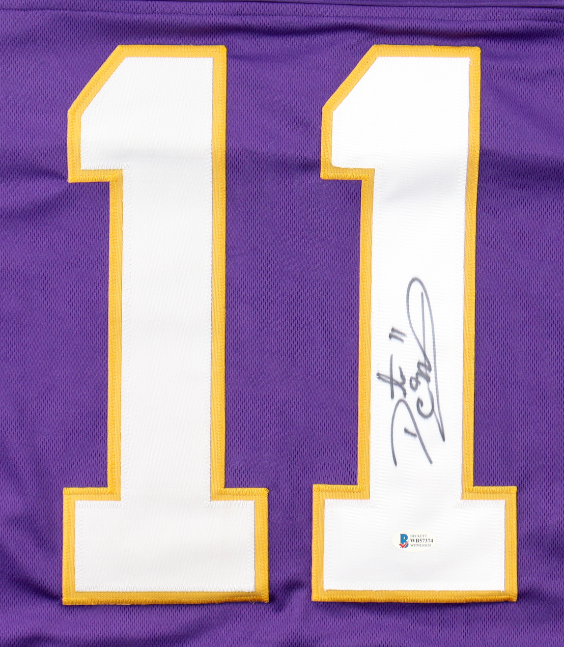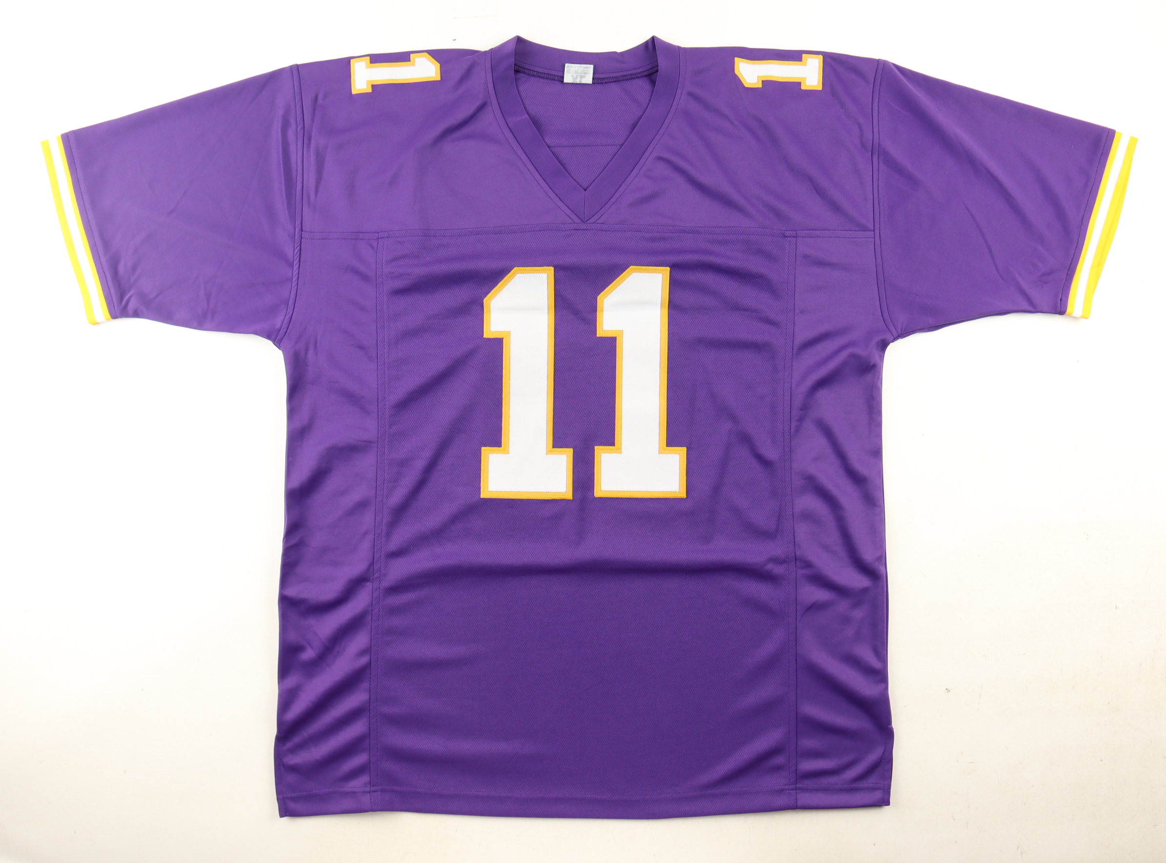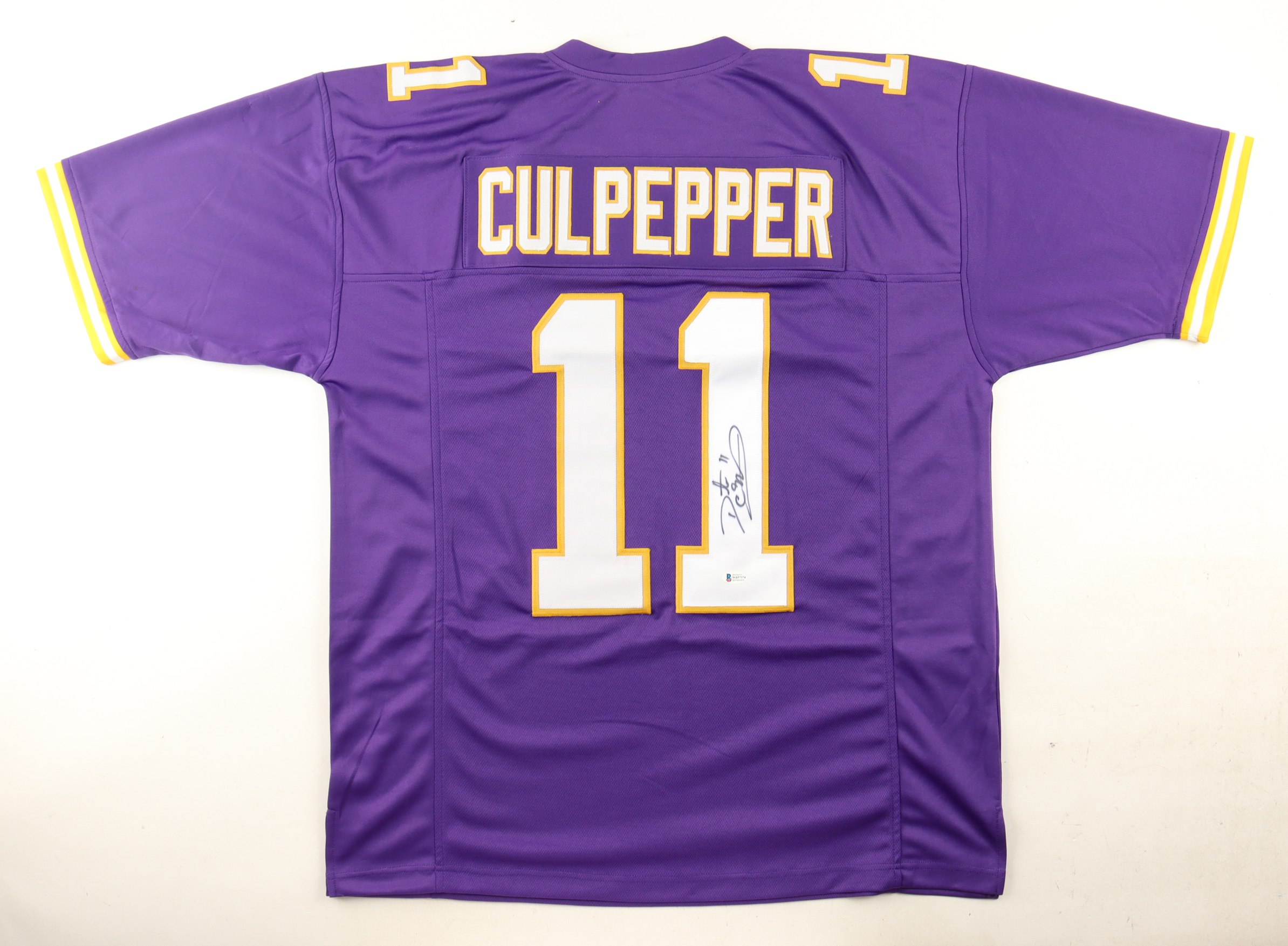 Custom jersey with everything sewn on, size XL. Hand-signed by Daunte Culpepper. Please note, the signature ink has bled.