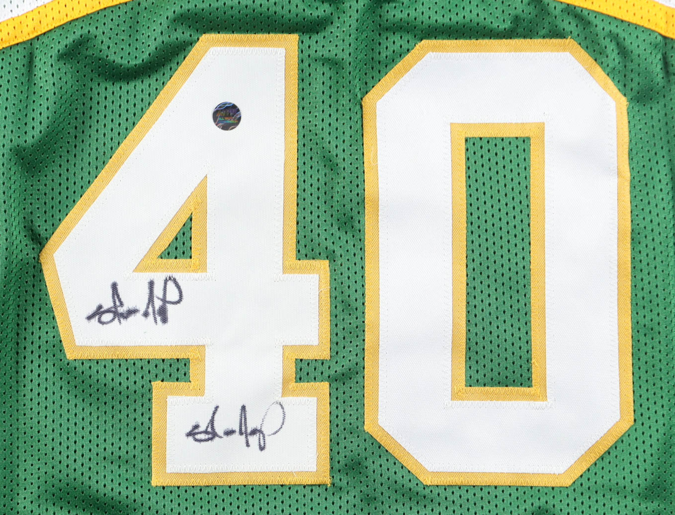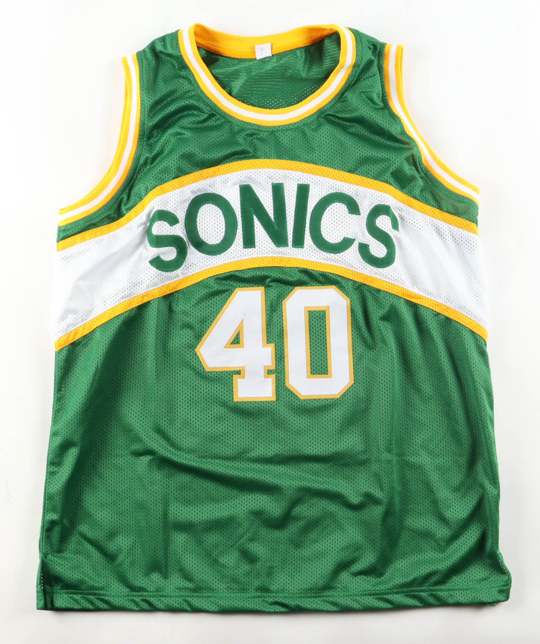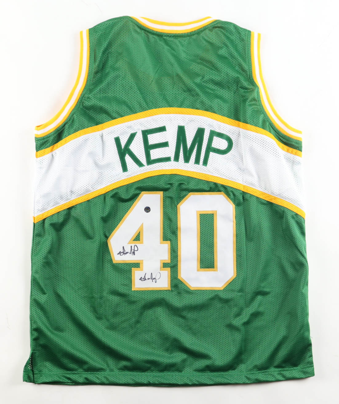 Custom jersey. Everything is sewn on, size XL. Hand-signed twice by Shawn Kemp. Please note, the signatures have bled.