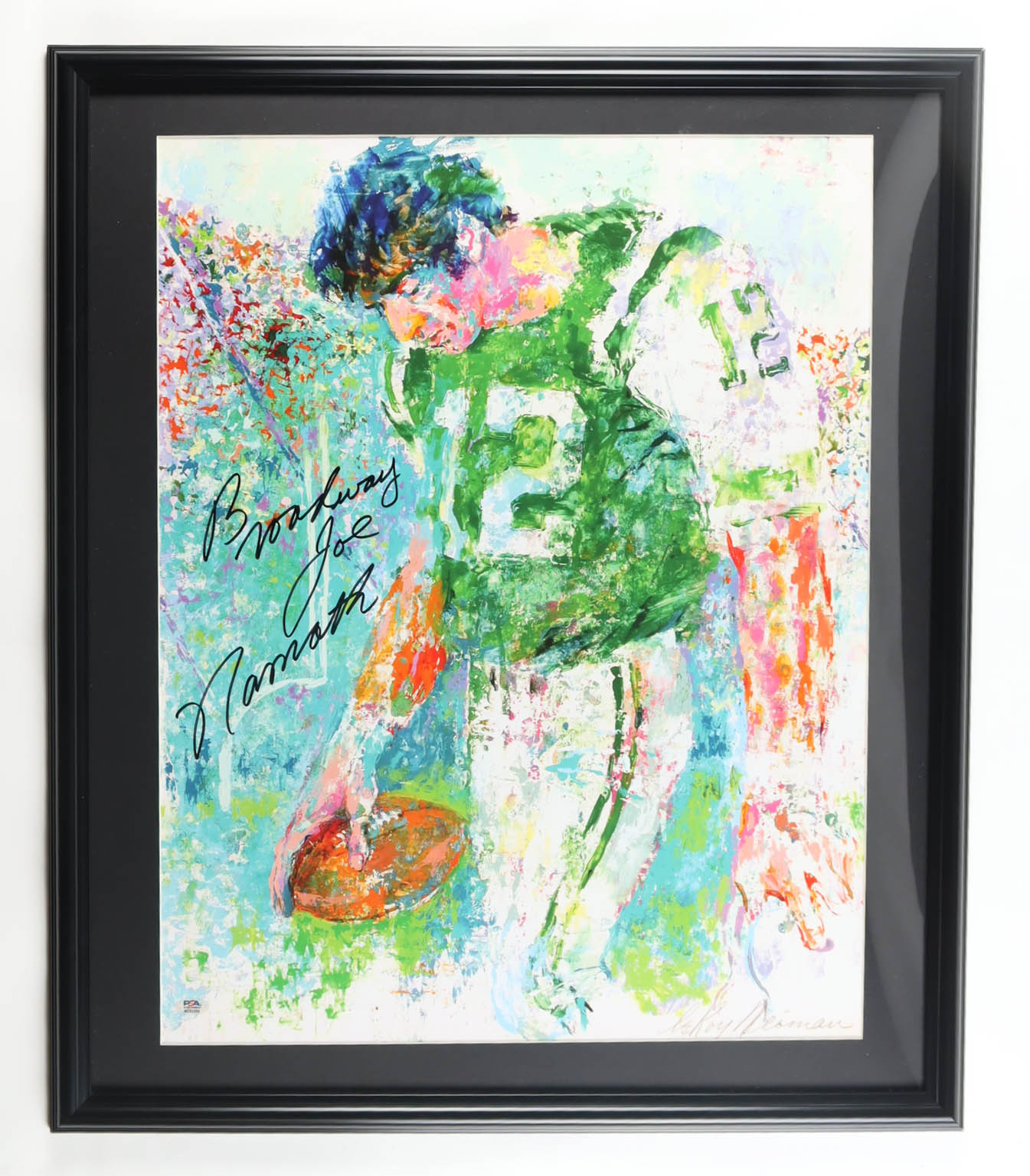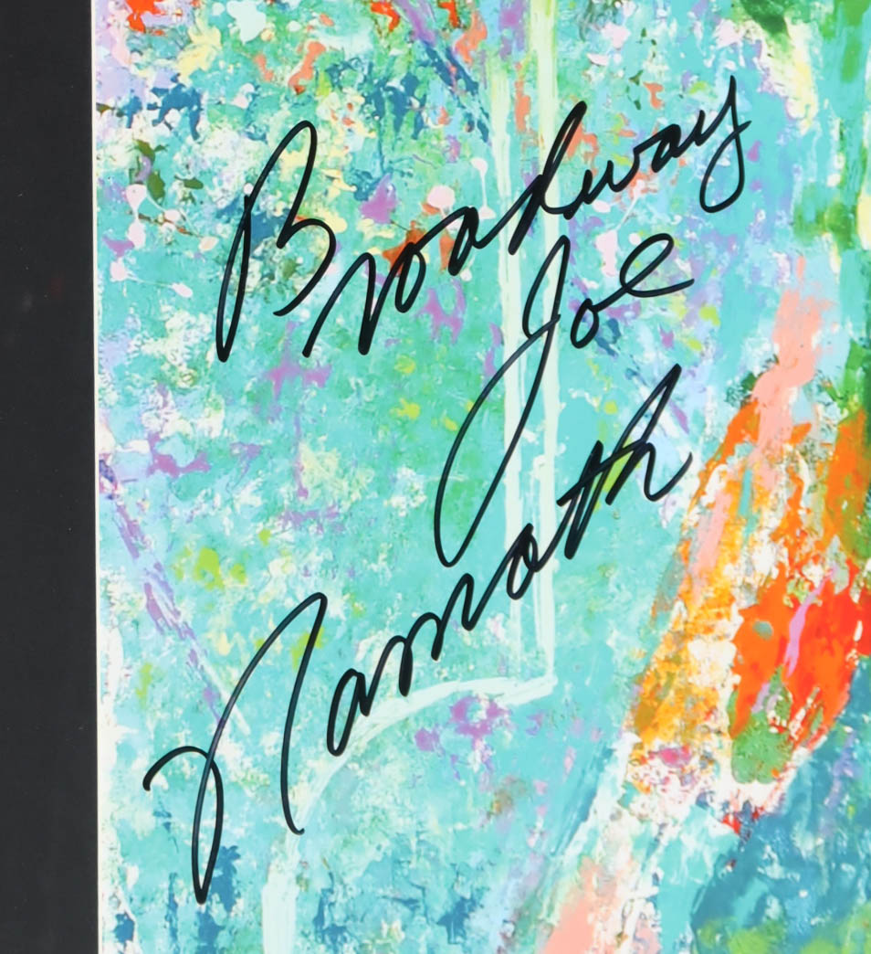 Custom frame measures approximately 26" x 30.5" in size and features an art print by LeRoy Neiman (D. 2012) that has been hand-signed and inscribed by Joe Namath (New York Jets, HOF). Please refer to photo regarding the condition of the item.