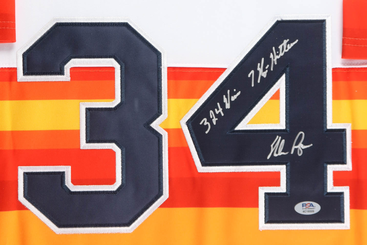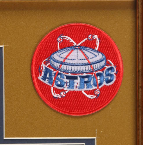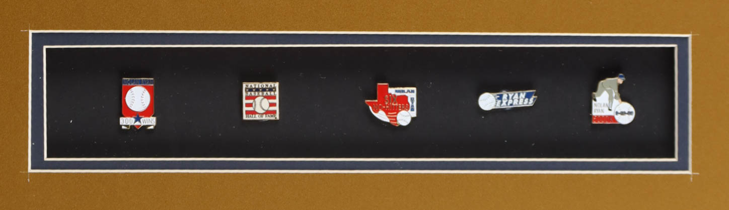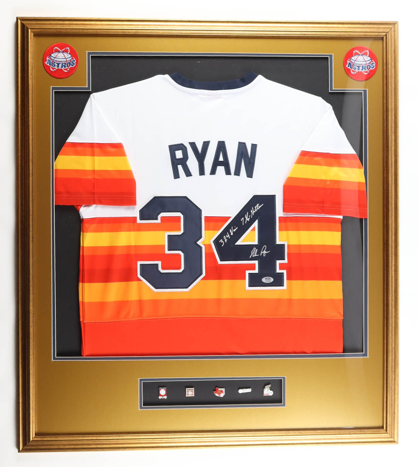 Custom frame measures approximately 33" x 37" in size and features a jersey that has been hand-signed and inscribed by Nolan Ryan (Houston Astros, HOF). Display also includes (5) Career Pins (2) Astros logo patches and (2) photos.