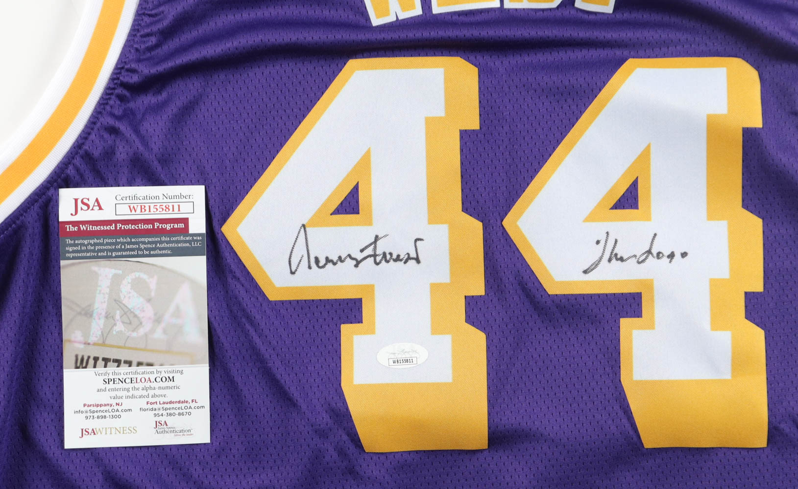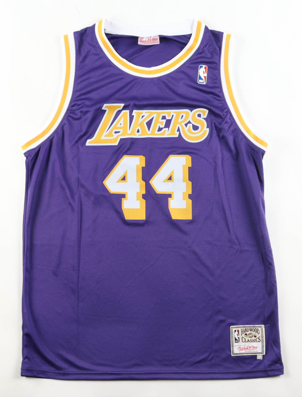 Mitchell & Ness jersey with everything pressed on, size XL. Hand-signed and inscribed by Jerry West (D. 2024, Los Angeles Lakers, HOF).