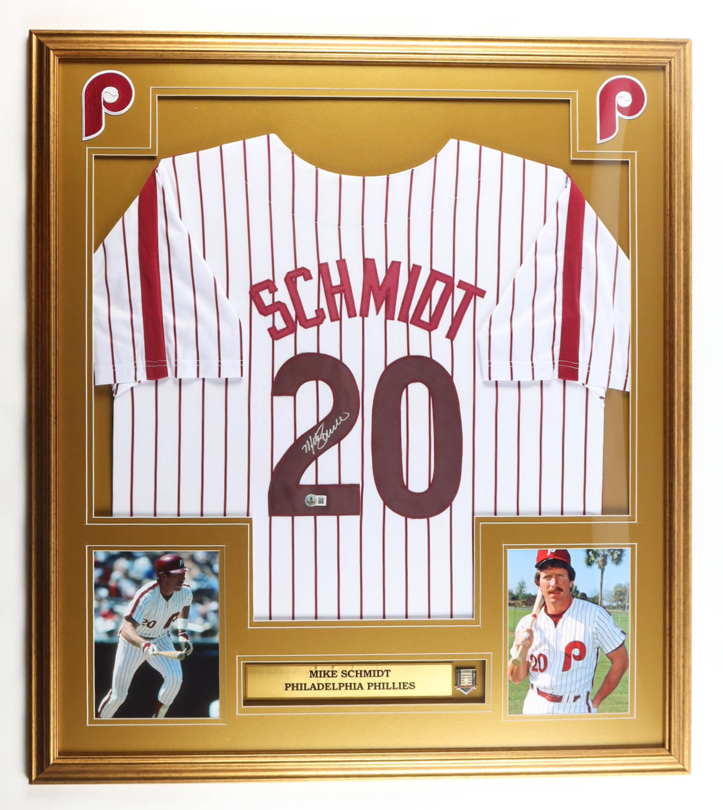 Custom frame measures 33" x 37" in size and features a jersey that has been hand-signed by Mike Schmidt (HOF). Display also includes a HOF pin, (2) photos and (2) patches.