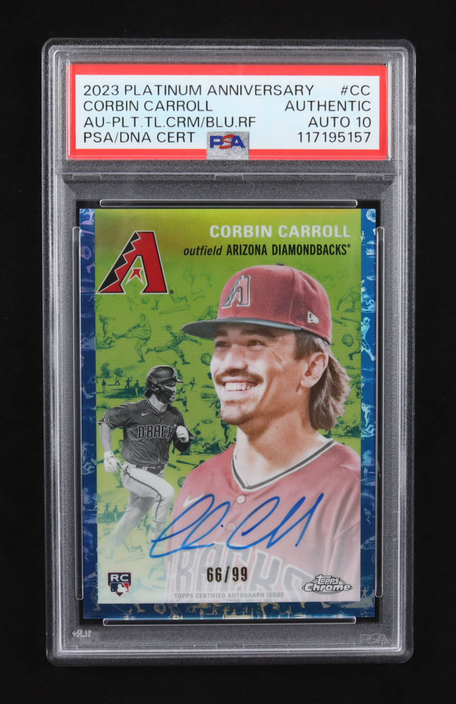 Corbin Carroll 2023 Topps Chrome Platinum Anniversary Blue Refractor Auto #CC RC #66/99 (PSA | Autograph Graded PSA 10)