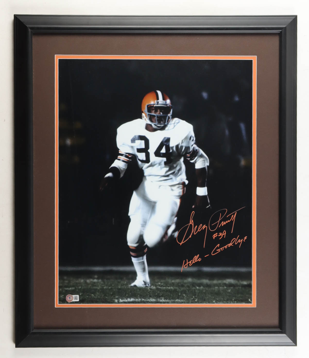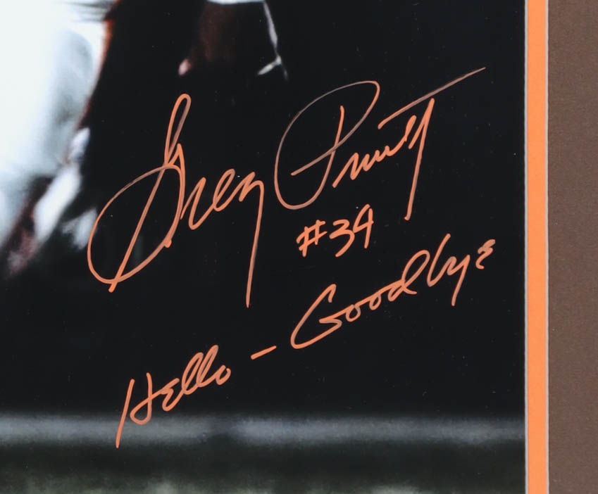 Custom frame measures approximately 22" x 27" in size and features a photo that has been hand-signed and inscribed by Greg Pruitt.