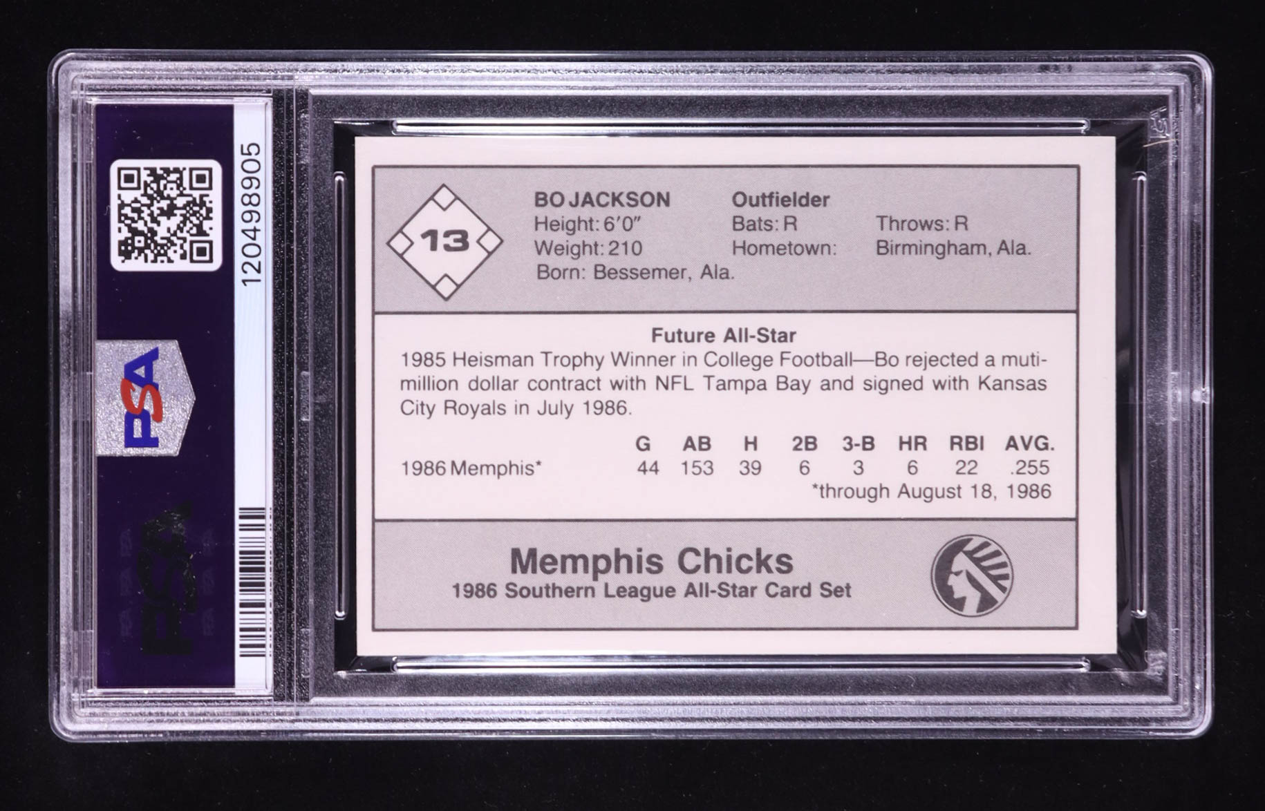 Bo Jackson 1986 Southern League All-Stars Jennings #13 RC (PSA 9)