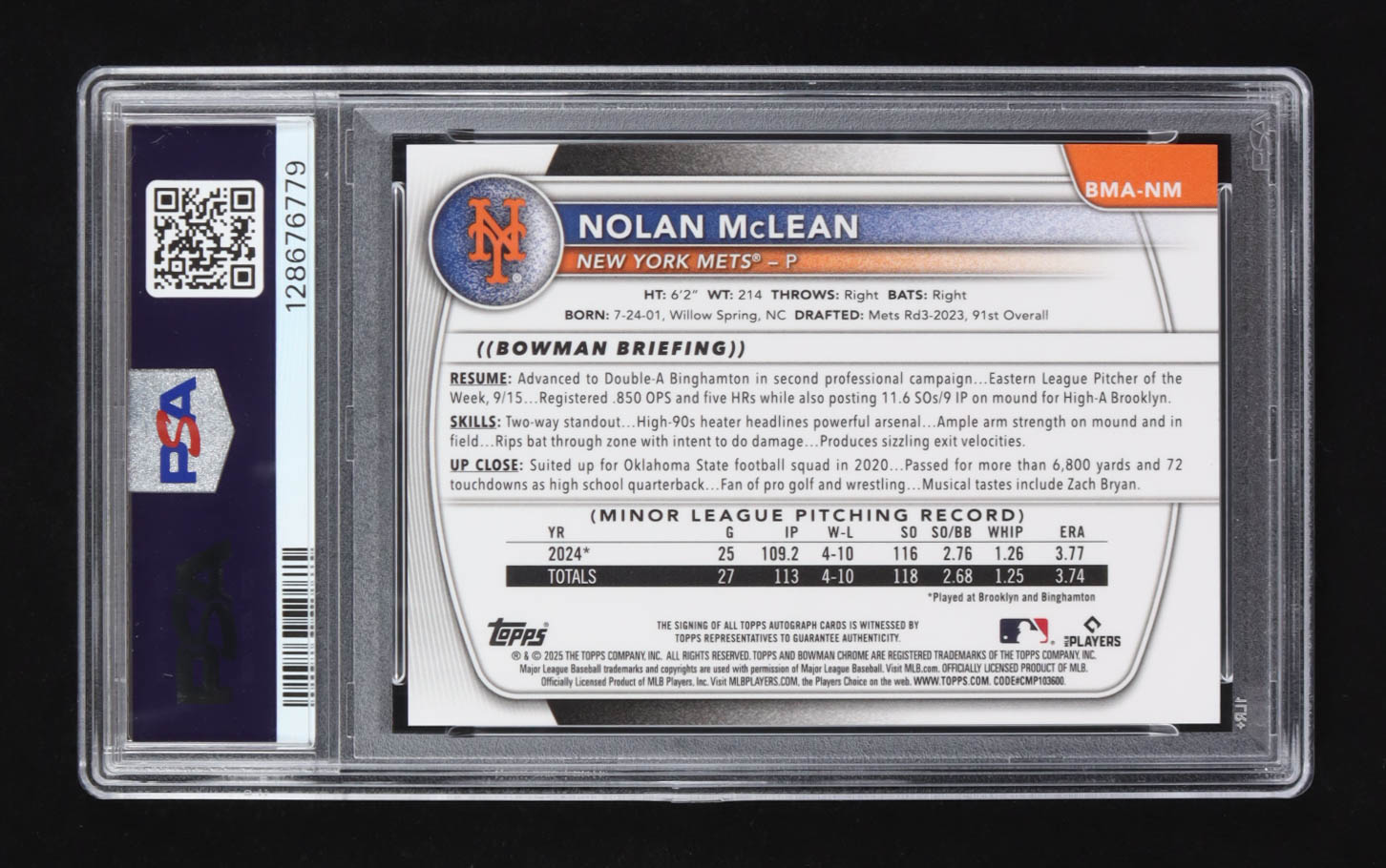 Nolan McLean 2025 Bowman Chrome Prospects Mega Box Autographs #BMA-NM RC (PSA | Autograph Graded PSA 9)
