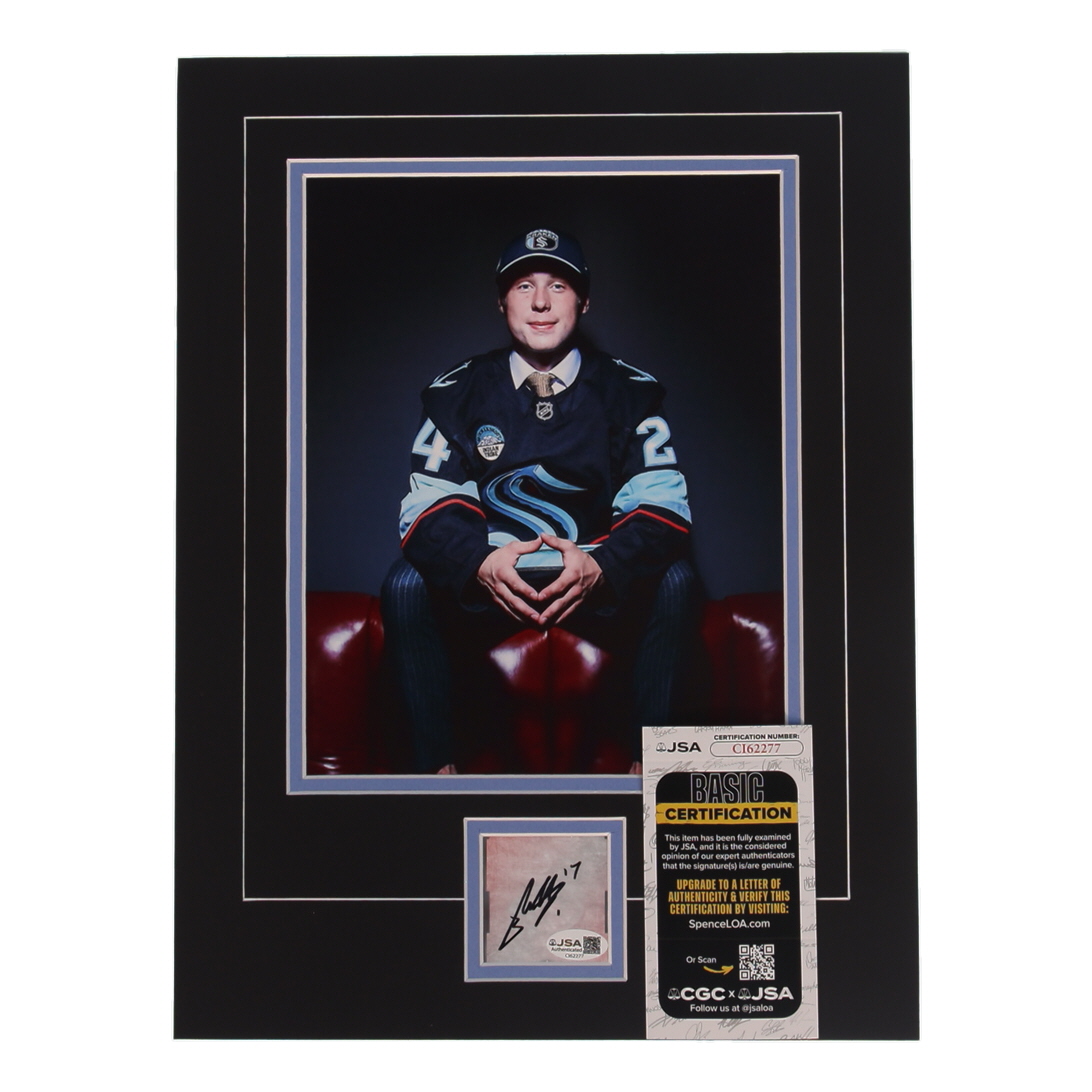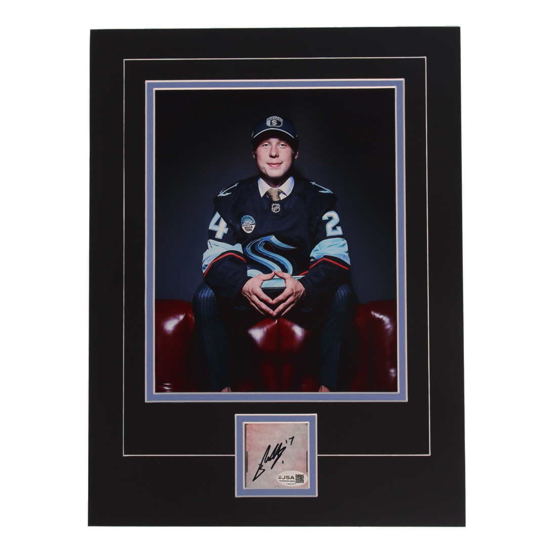 Custom photo display measures approximately 12" x 16" in size and features a cut that has been hand-signed by Berkly Catton (Seattle Kraken).