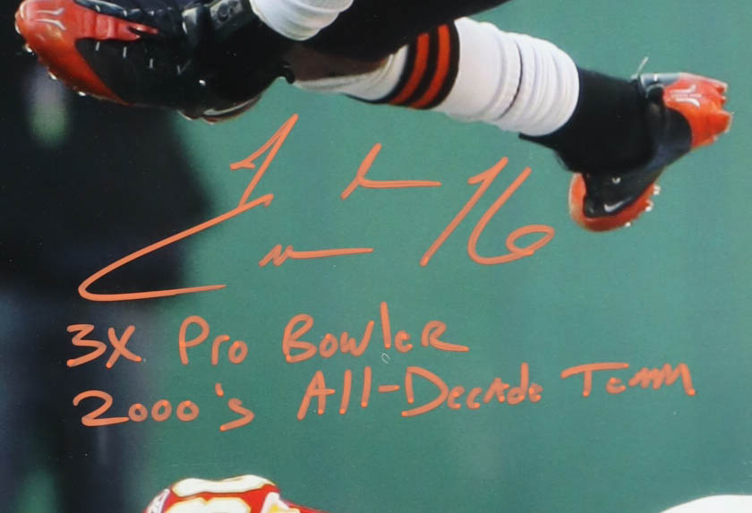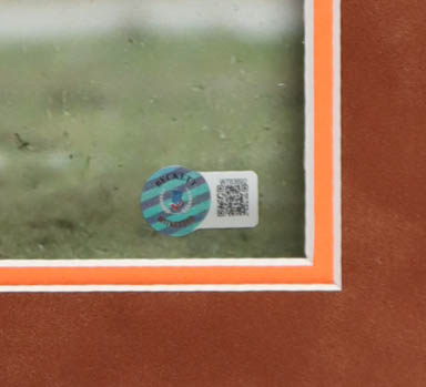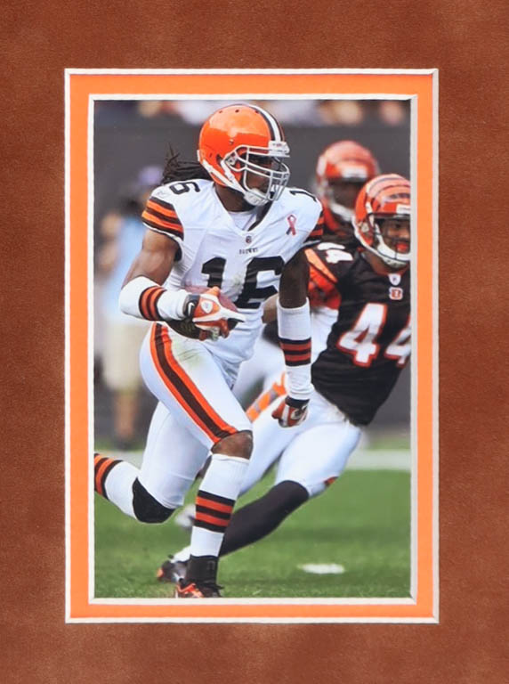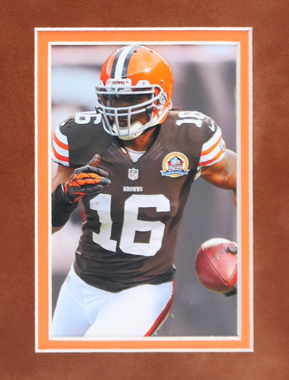 Custom frame measures approximately 24.5" x 33" in size. Featuring a photo that has been hand-signed and inscribed by Josh Cribbs (Cleveland Browns).