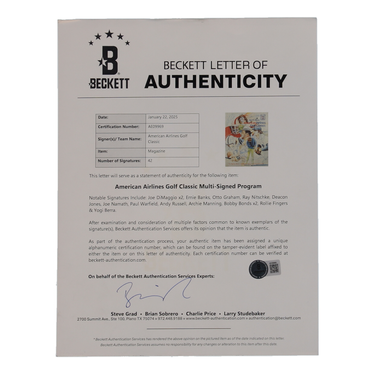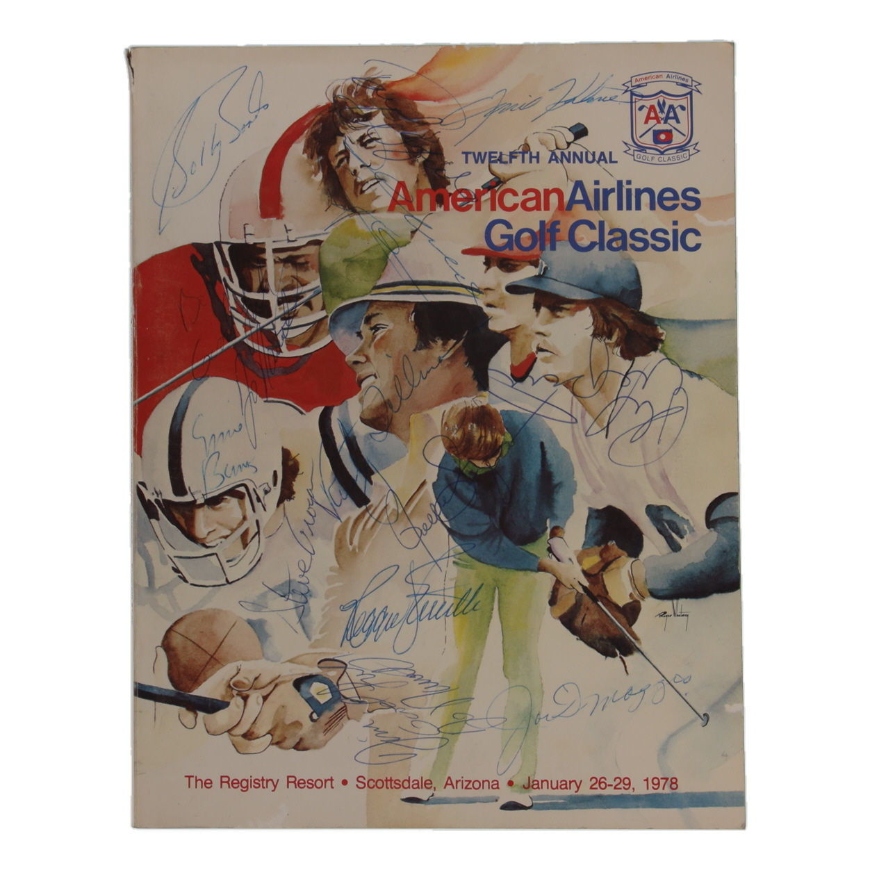 "American Airlines Golf Classic" dated January 26-29, 1978 has been hand-signed by (42) with Yogi Berra, Joe DiMaggio (Twice-Signed), Joe Namath, Deacon Jones, Ernie Banks, Otto Graham, Bobby Bonds (Twice-Signed), Rollie Fingers, Ray Nitschke, Paul Warfield, Archie Manning, Andy Russell and (28) others. Please note, there is scuffing, corner wear, tears and staining on the cover.