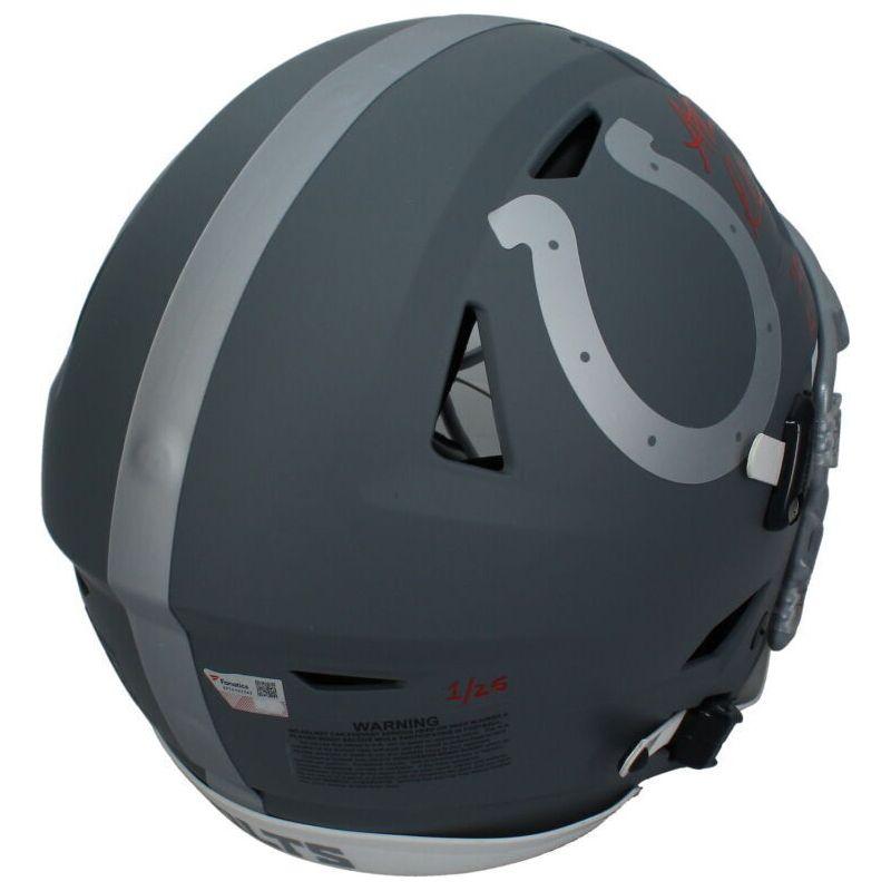 Riddell Indianapolis Colts full-size authentic on-field slate alternate speedflex helmet has been hand-signed and inscribed by Anthony Richardson. This item is limited edition and has been numbered #1/25.