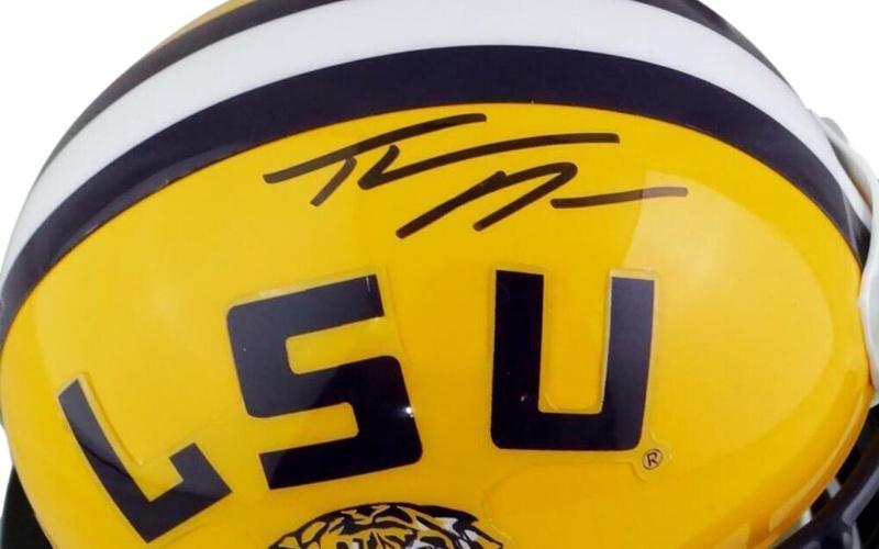 Schutt LSU Tigers mini helmet has been hand-signed by Thaddeus Moss.