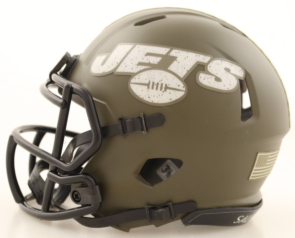 Riddell New York Jets Salute To Service Alternate Speed mini helmet. Hand-signed By Justin Fields.